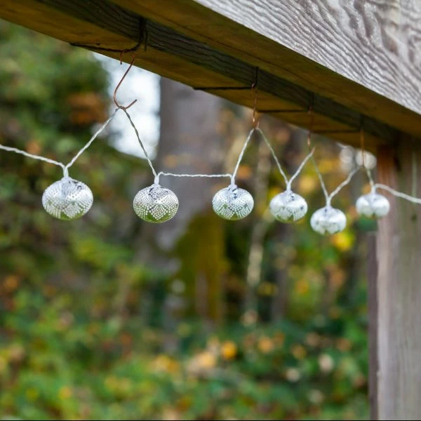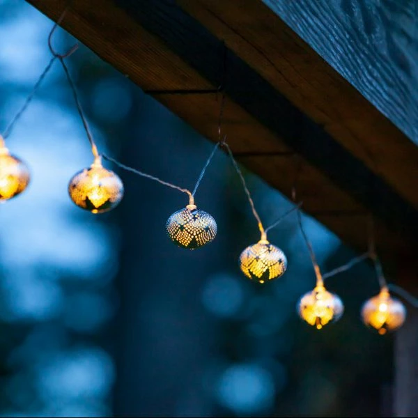 Our Marrakesh Metallic string lights will dance and glimmer wherever you need some bling. Inspired by the iconic lighting in the bazaars of Morocco, these intricately punched solar string lights bring a sophisticated and elegant look to any outdoor space. Uniquely designed by our in-house art team, the Marrakesh solar string lights shine by day and glimmer with gorgeous punched patterns at night.