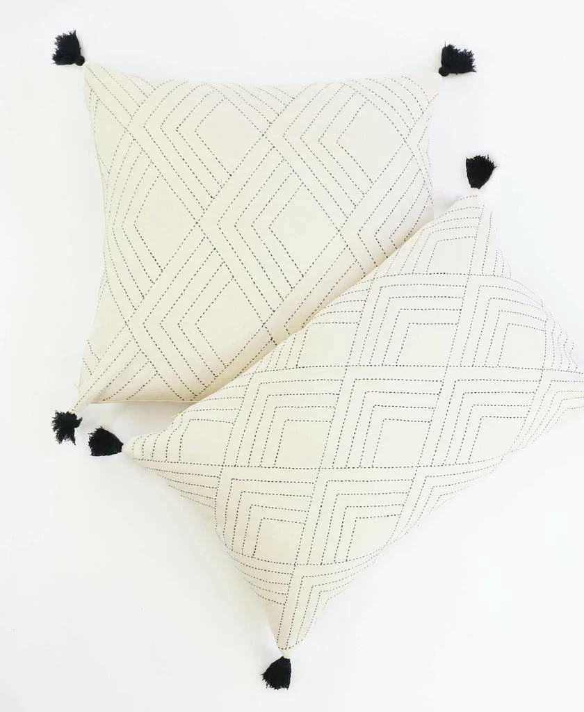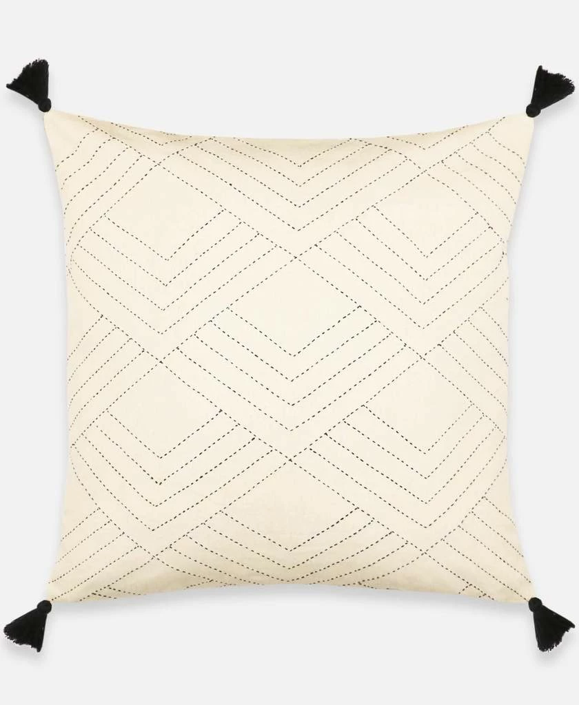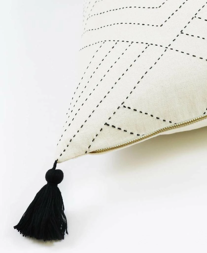 Rich with artistic sensibility, this bone-white accent pillow features contrasting geometric stitching and charming tassels. Mix and match sizes, colors and patterns to create a monochromatic combination, perfect for any modernist home.