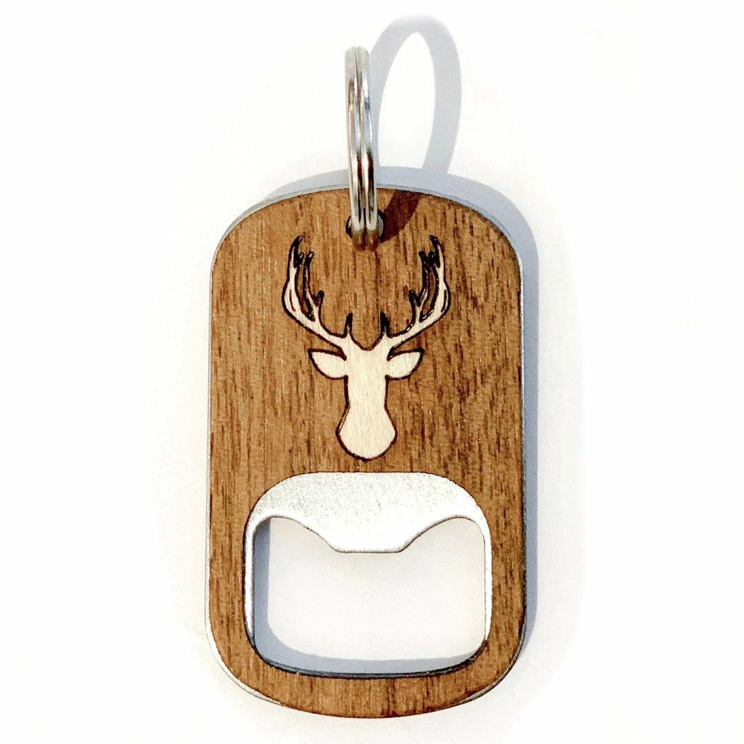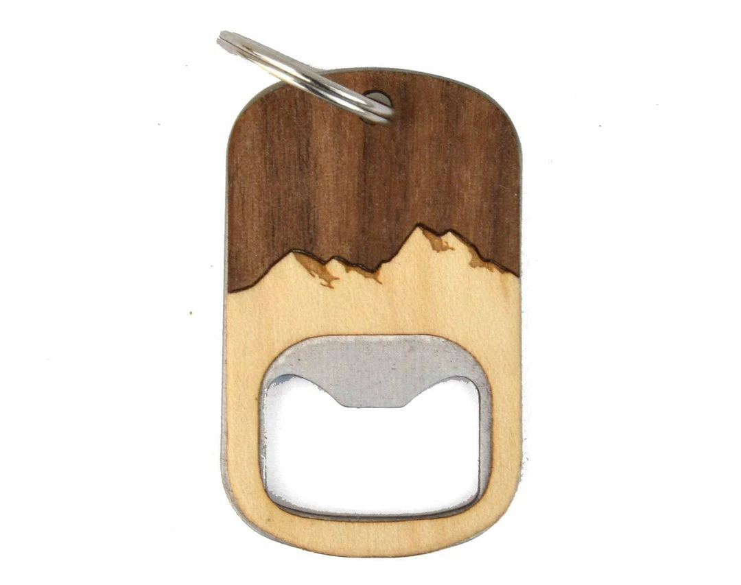 There bottle opener keychains features a background of Black Walnut wood and a Maple inlay.