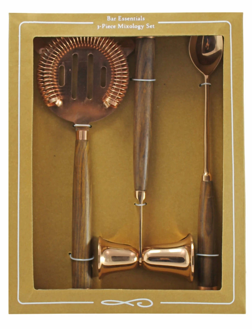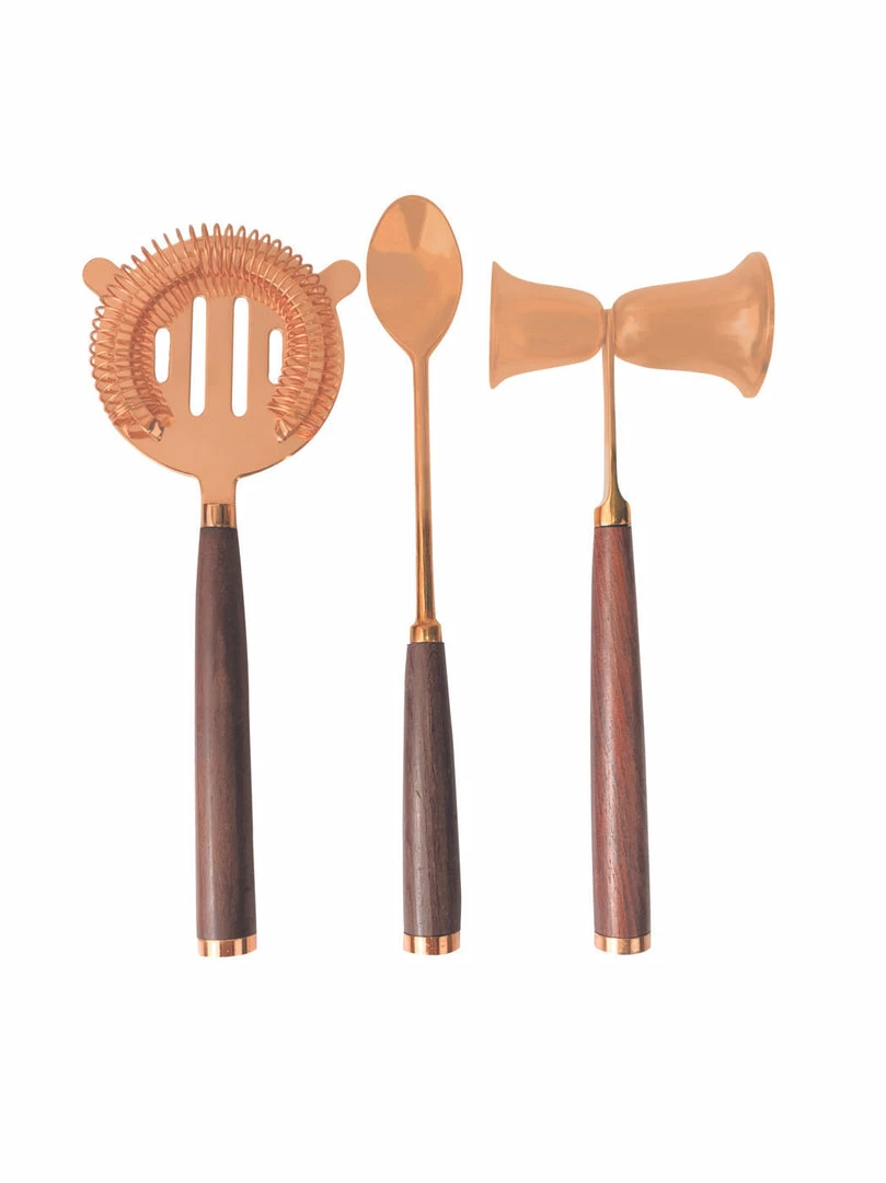 Measure, stir and pour with this stainless steel copper and wood handle bar set
