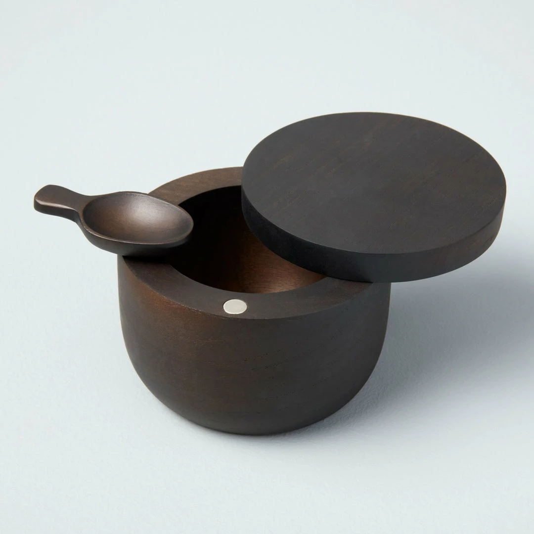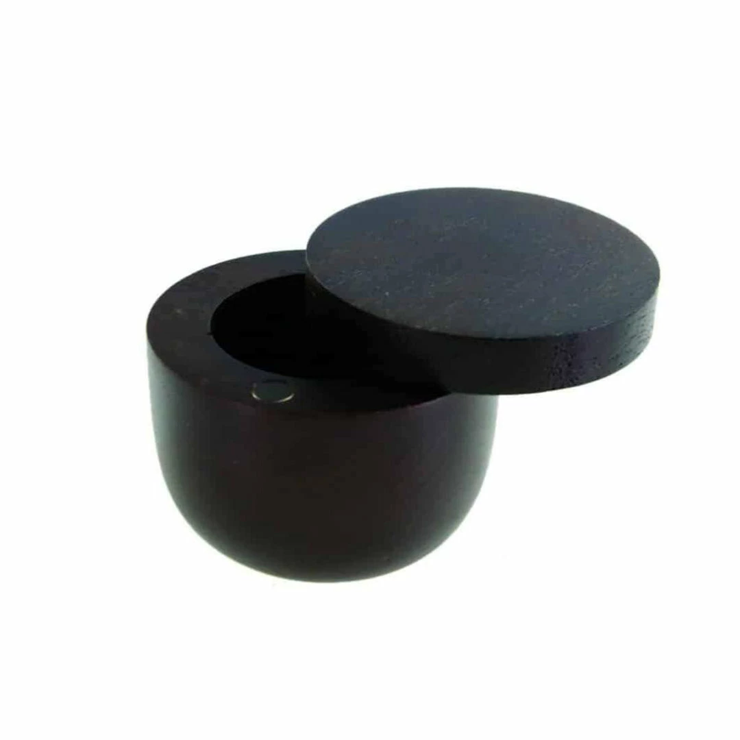 Ebony teak wood pinch container with magnetic swivel lid.