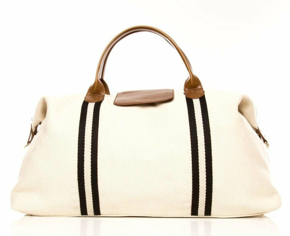 The perfect Summer duffel bag is a versatile bag that flows easily from travel to everyday. This casual, cool Holdall has a roomy interior that can comfortably hold enough for a long weekend, yet is still compact enough to throw on your passenger seat. This classic, cotton canvas bag features a long removable strap, vegan leather accents, and a satin lined interior.