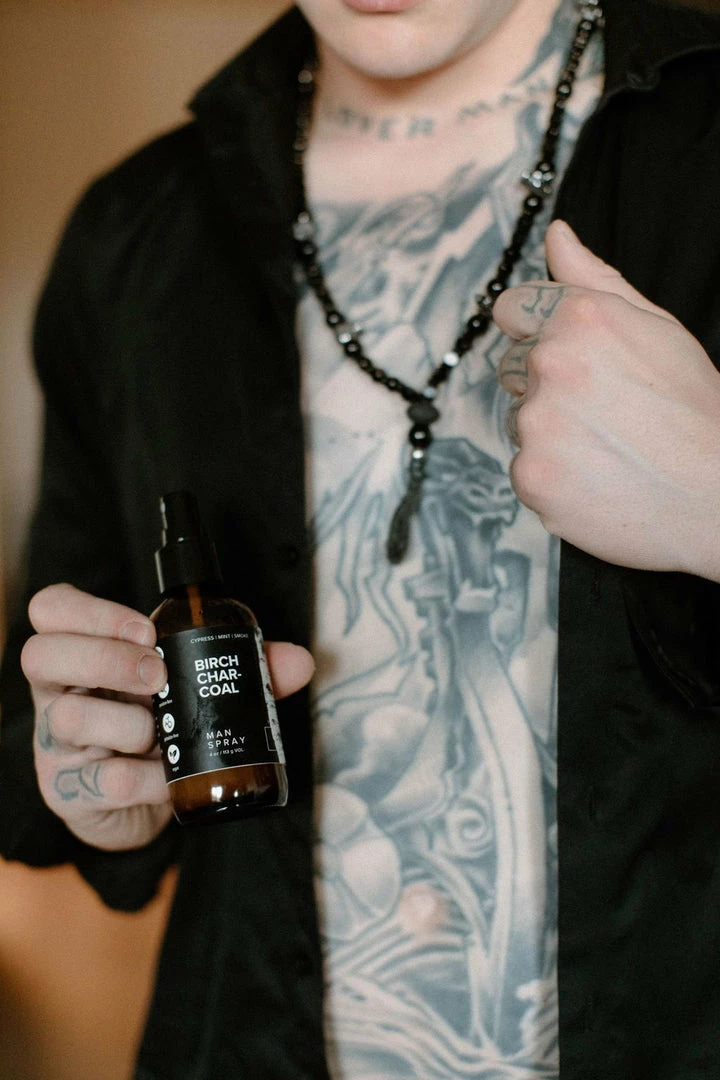 Geotanical man spray for quickly sprucing up your living space. It’s no secret that a lot of stuff happens in the living room, bedroom, and bathroom. No problem, just “Man Spray” the bad smells away! Fun fact: Man Spray is skin safe and doubles as a body mist in a pinch! Birch Charcoal consists of cooling eucalyptus and sweet smoke to light up your senses, followed by pungent wooded notes of cypress.