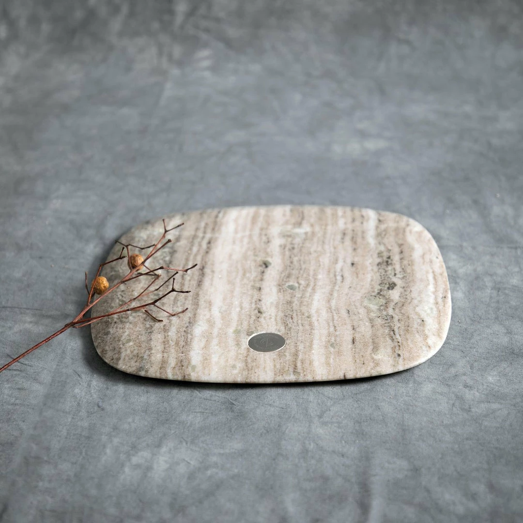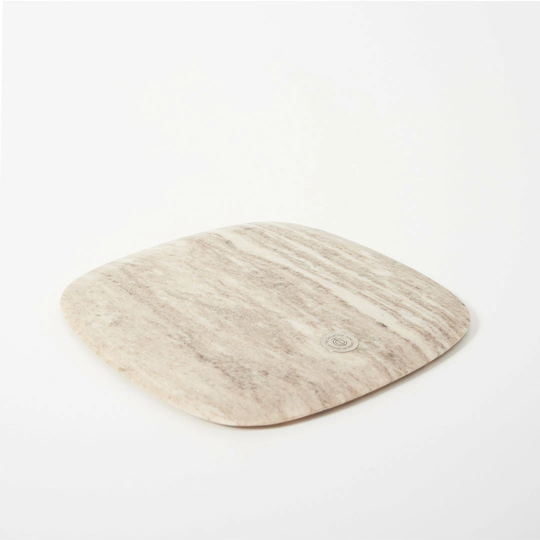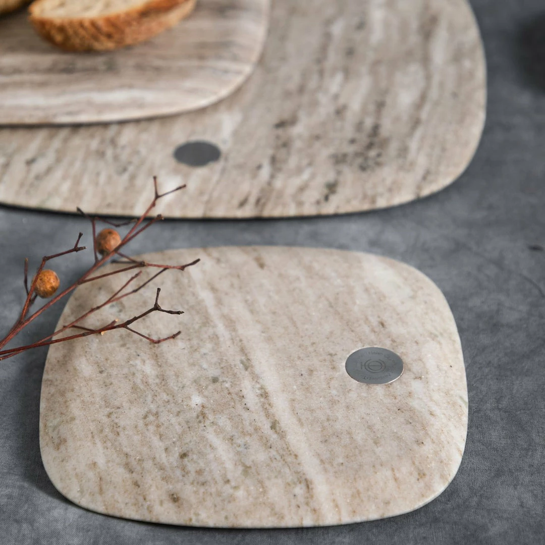 Skilled artisans craft each marble board by hand, shaping it with beveled edges and a smooth top and adding our logo medallion as a finishing touch. The natural material displays thin bands of gray and white within, guaranteeing no two boards look exactly alike.