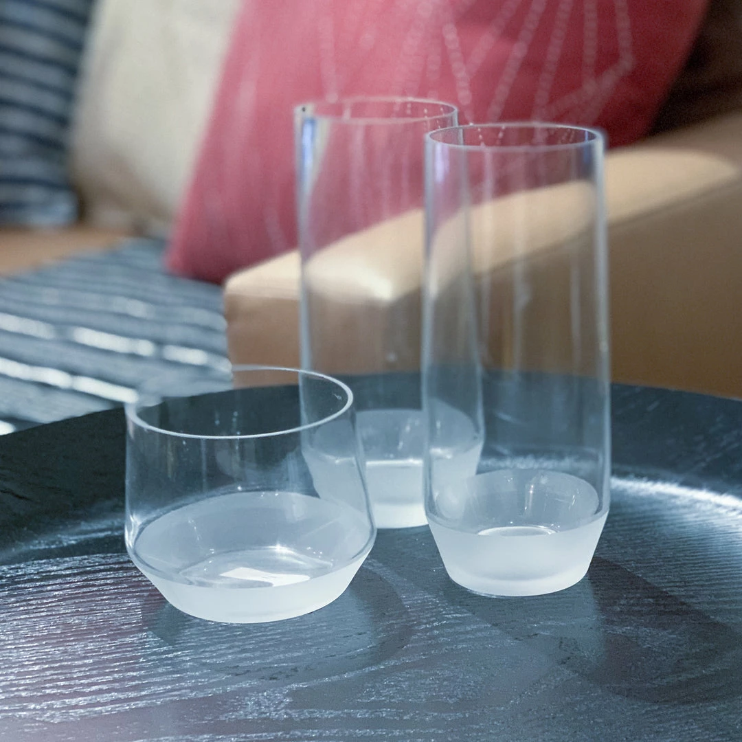 Clear glasses with pleasing modern angles is partially sand-blasted for a contrasting, fine-textured frost effect.