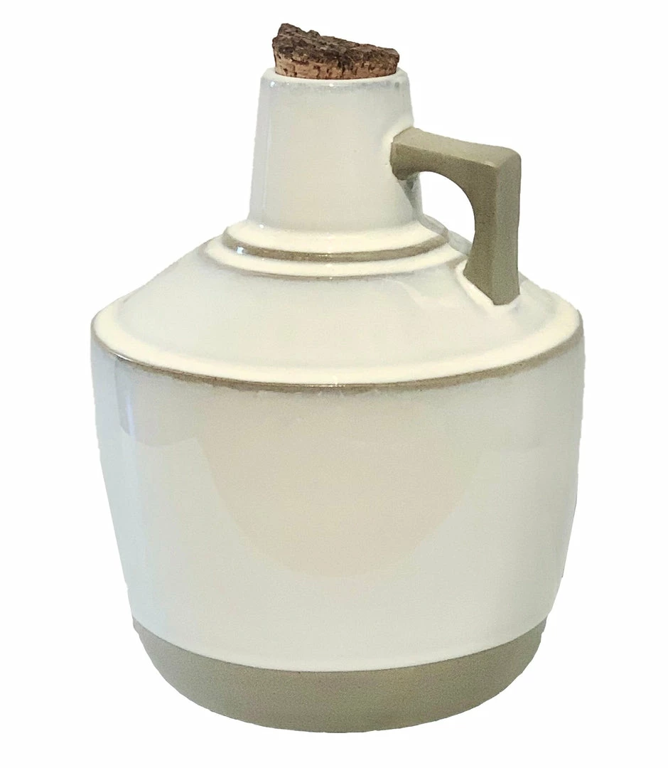These growlers are crafted from gray stoneware that is left exposed on the bottom of each piece but otherwise glazed inside and Out with a creamy white glaze; natural cork stopper included.
