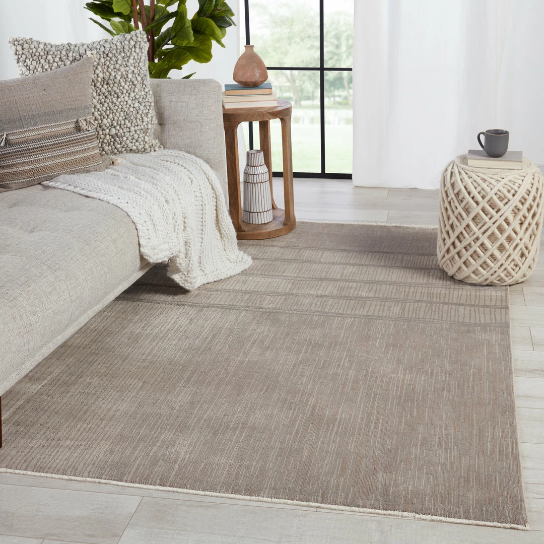 The simple and stylish Aura collection boasts a complementary mix of neutral tones combined with modern, linear motifs. The versatile Ewan rug grounds any space with a unique linear pattern and tonal gray hues. Soft and lustrous, this chameleon-like design emulates the timeless look of a hand-knotted rug, but in an accessible polyester and viscose power-loomed quality.