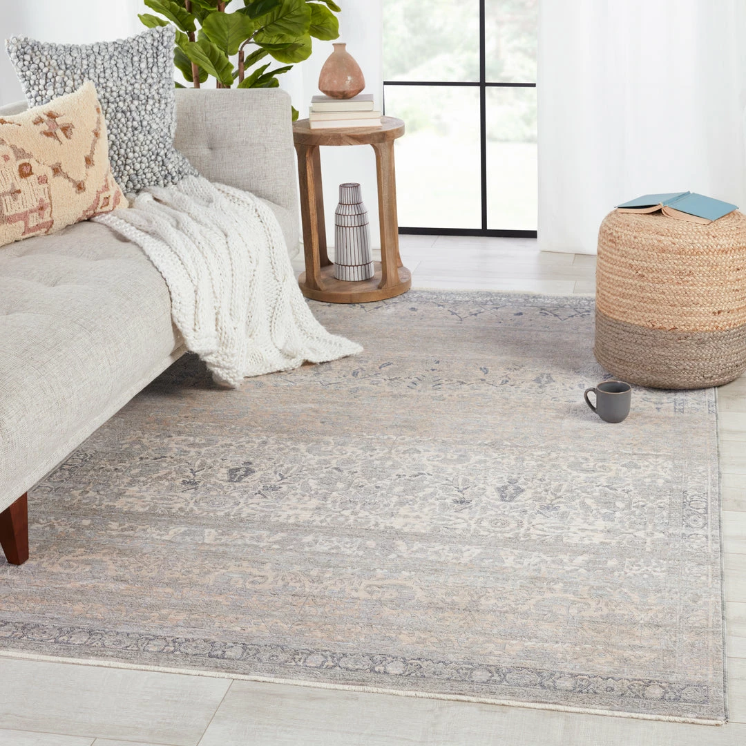 The Ballad collection features soft luxurious pile and serene, dimensional colorways created by the space-dyed yarns. The Amerie rug boasts an ornate, vintage-inspired pattern that complements transitional and contemporary spaces with grounding tones of beige and gray. Perfect for heavily trafficked spaces, this polyester rug is easy to clean and perfect for homes with pets and children.