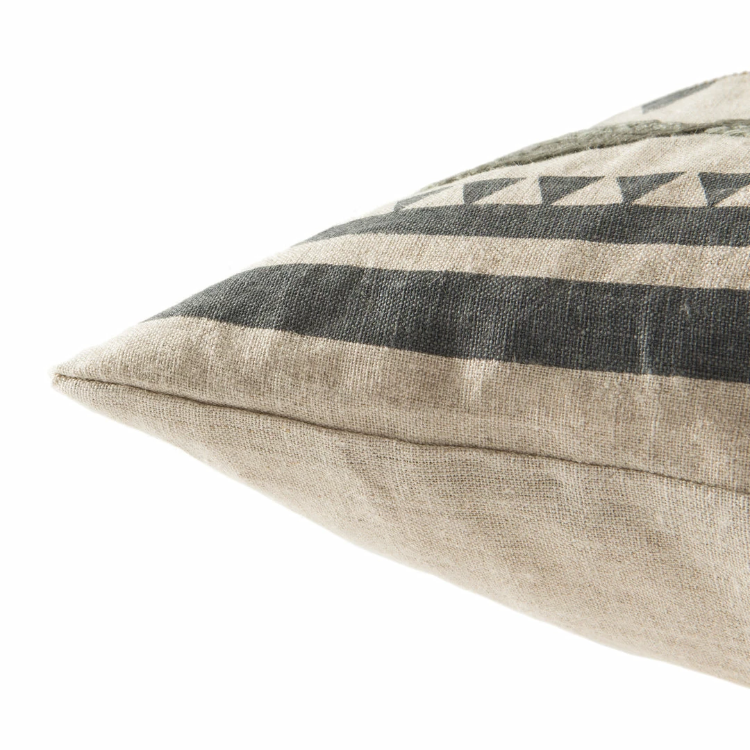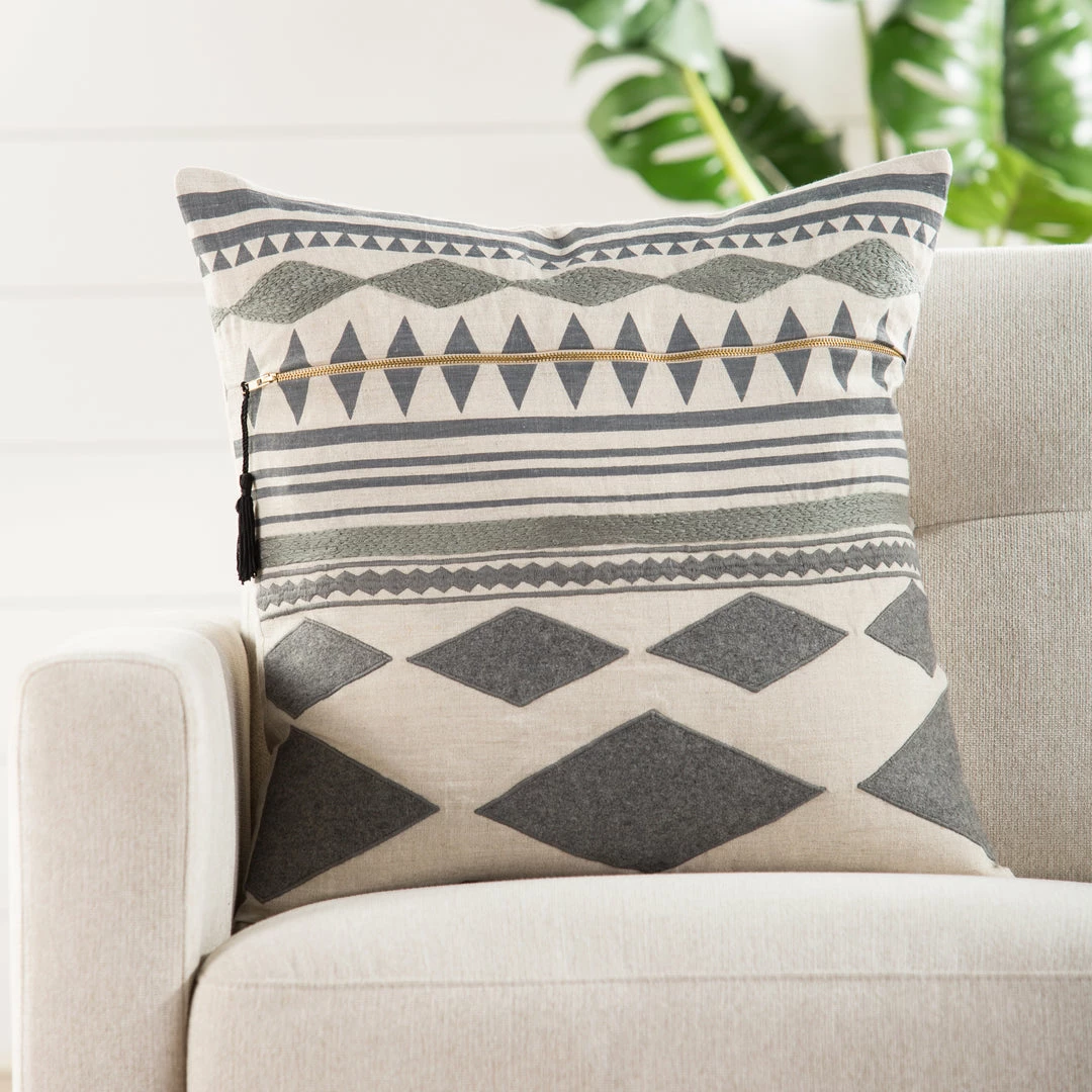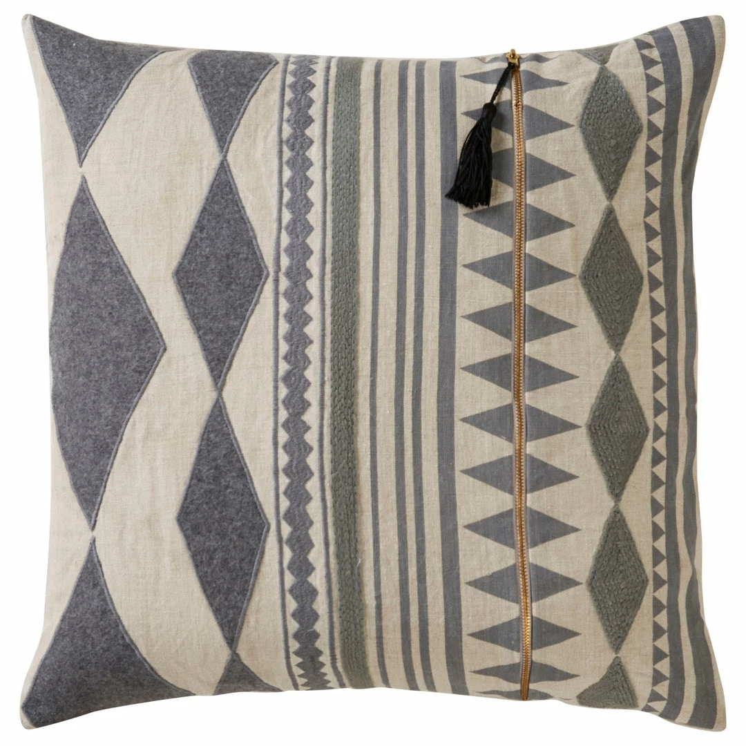Borrowing from global motifs, this Nikki Chu throw pillow merges modern design with worldly geometric patterning. Black diamond and striped embroidery lends eye-catching accent to the beige linen backdrop, while a gold zipper detail and black tassel decorate the front of this distinctive cushion.