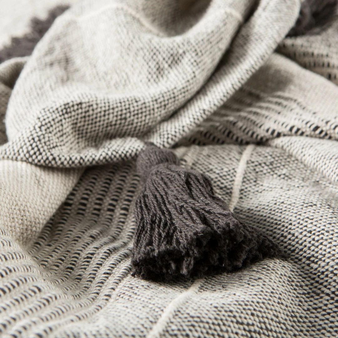 The Sojourn throw collection features a blend of inviting textures with globally inspired details. The Notre cotton blanket showcases a mix of ticking stripes and color-blocked patterning in soft gray and ivory tones. Chunky charcoal gray tassels trim the edges of this throw for a boho-chic vibe.