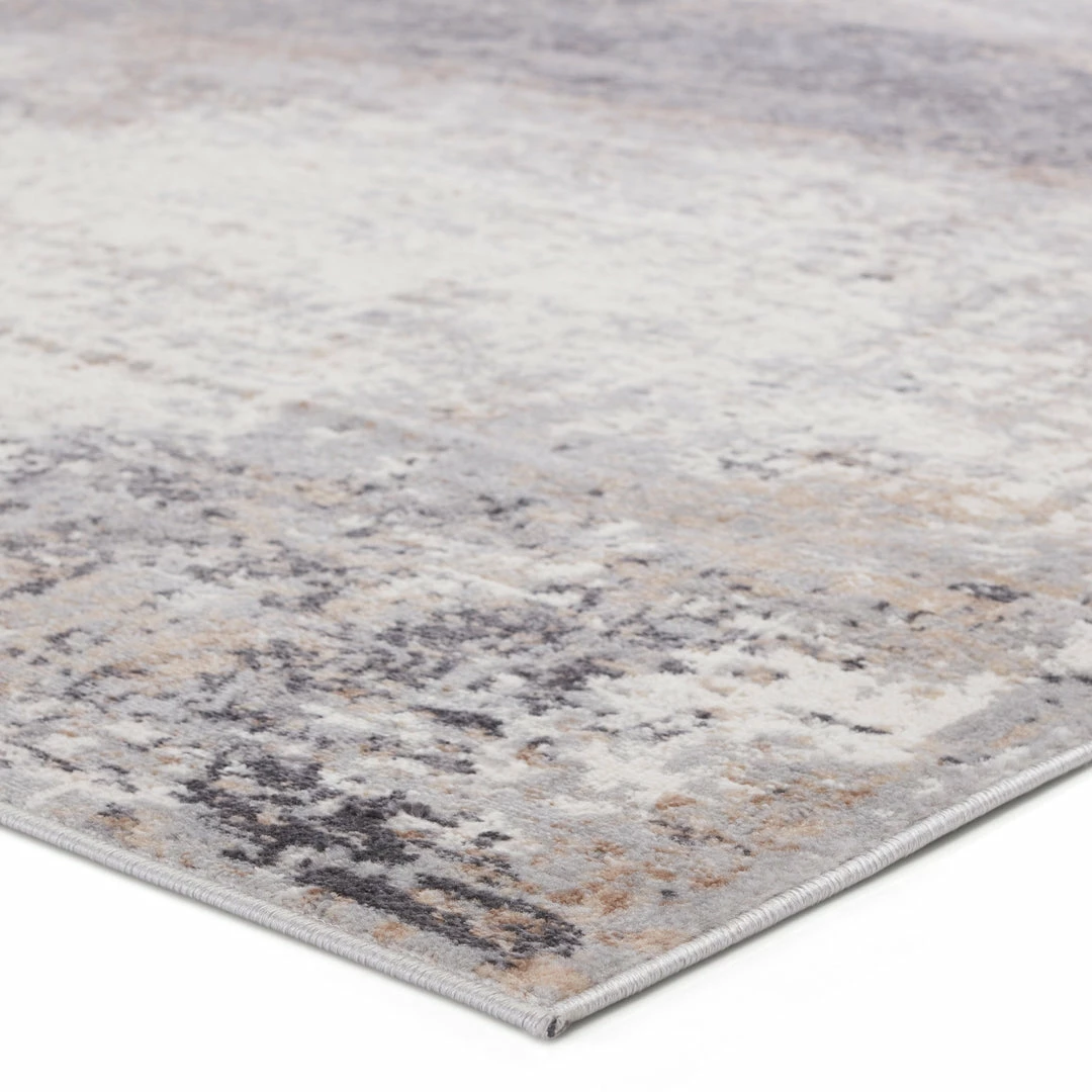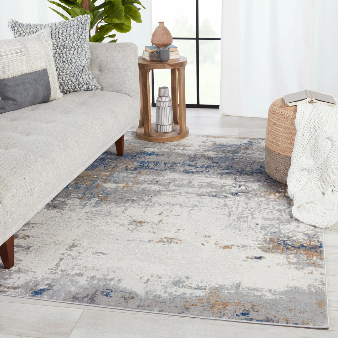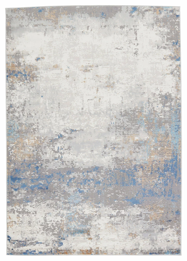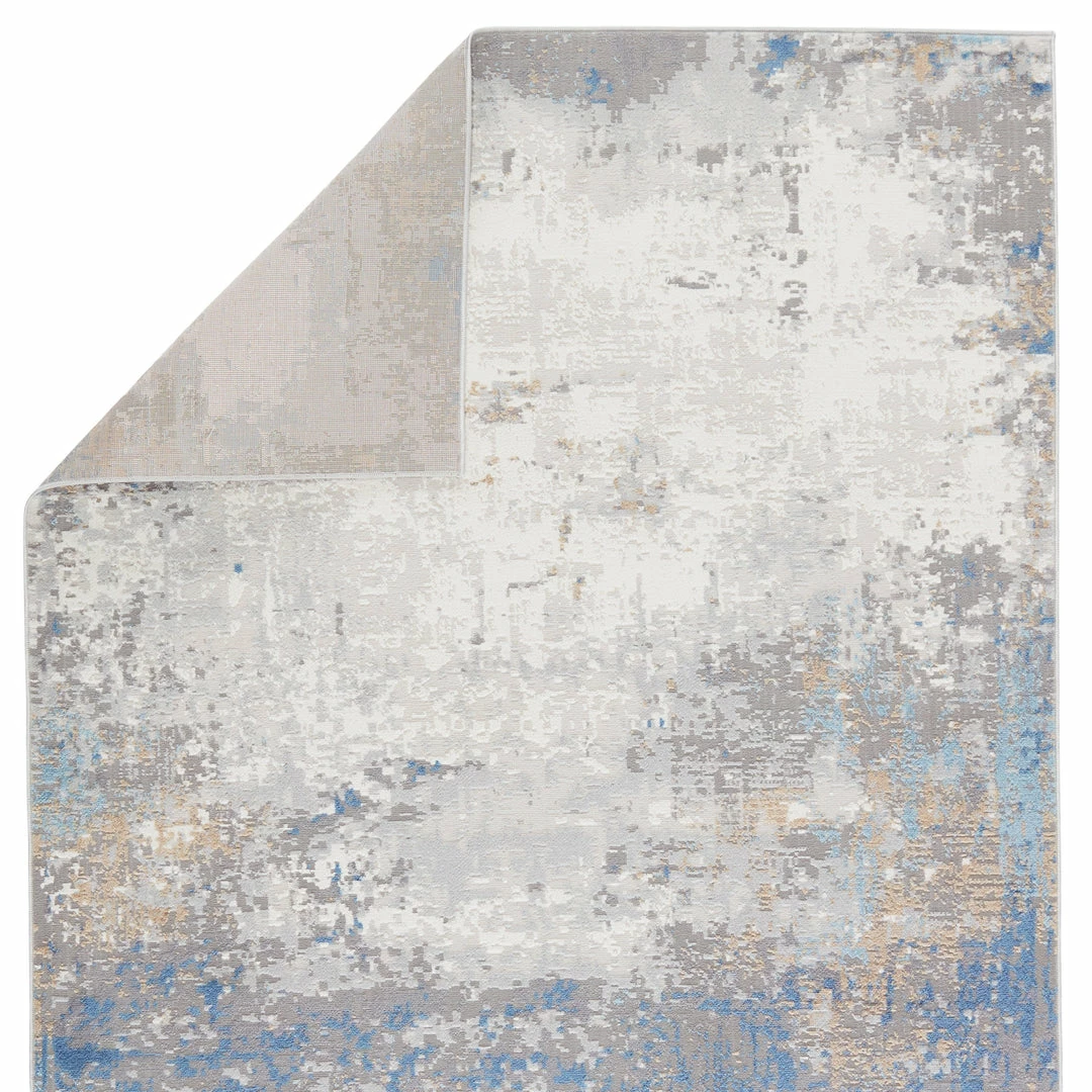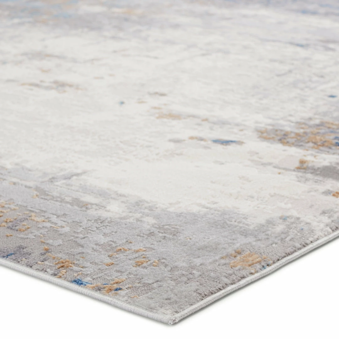 The modern Grotto collection boasts a neutral palette with subtle pops of color combined with formation-like motifs. The textural yet versatile Delano rug grounds any space with a mottled abstract pattern in tones of light gray, blue, tan, gold, and ivory. Perfect for heavily trafficked spaces, this polyester-polypropylene blend rug is easy to clean and perfect for homes with pets and children.