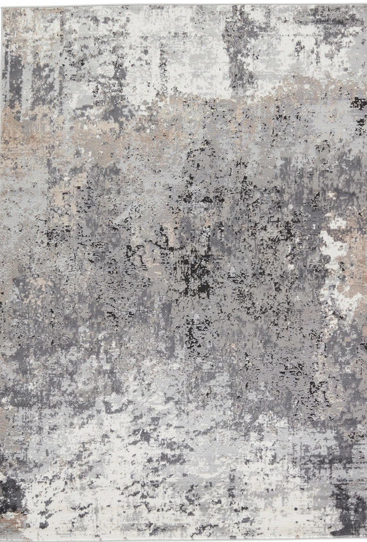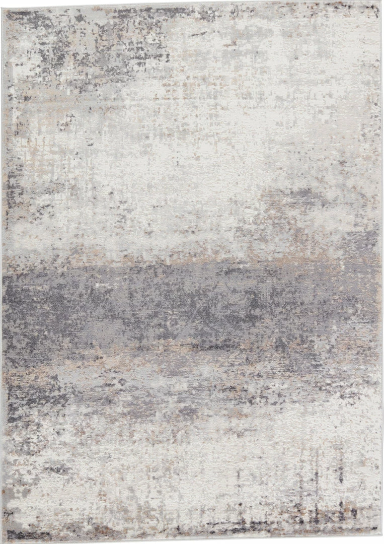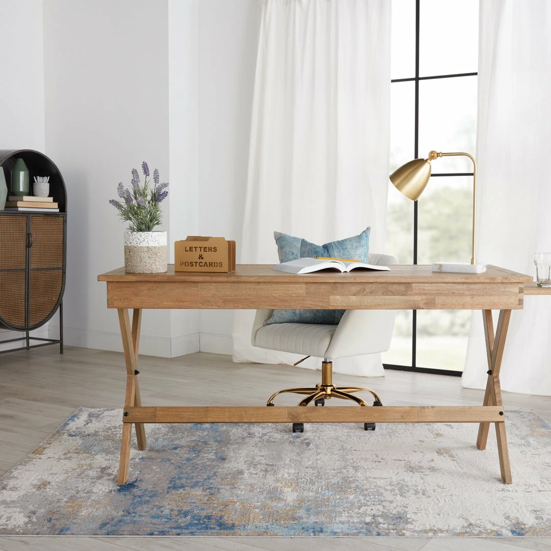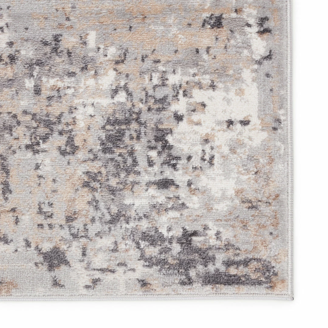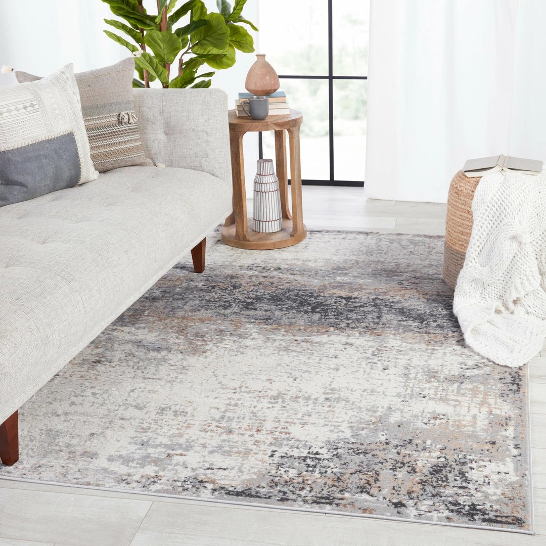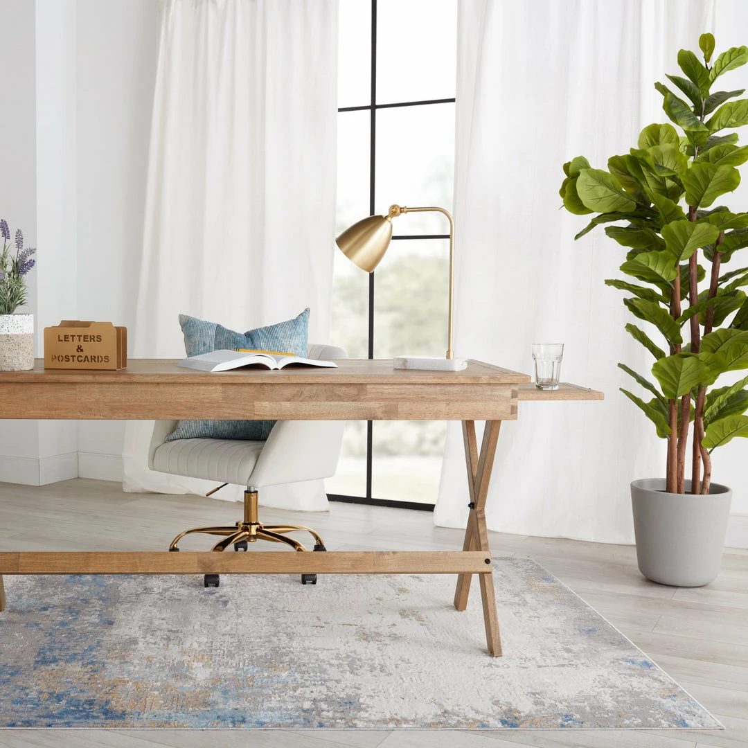 The modern Grotto collection boasts a neutral palette with subtle pops of color combined with formation-like motifs. The textural yet versatile Delano rug grounds any space with a mottled abstract pattern in tones of light gray, blue, tan, gold, and ivory. Perfect for heavily trafficked spaces, this polyester-polypropylene blend rug is easy to clean and perfect for homes with pets and children.