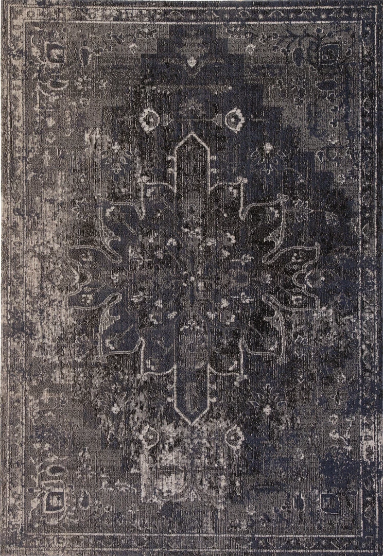 Capturing the beauty of antique Turkish rugs, the indoor-outdoor Polaris collection combines admired traditional designs with a durable, light-weight polypropylene construction. The Isolde rug features an abrashed and timeless Serapi medallion in dark blue and black. This overdyed-inspired floor covering offers a versatile yet statement-making addition to dining rooms, patios, and kitchens.