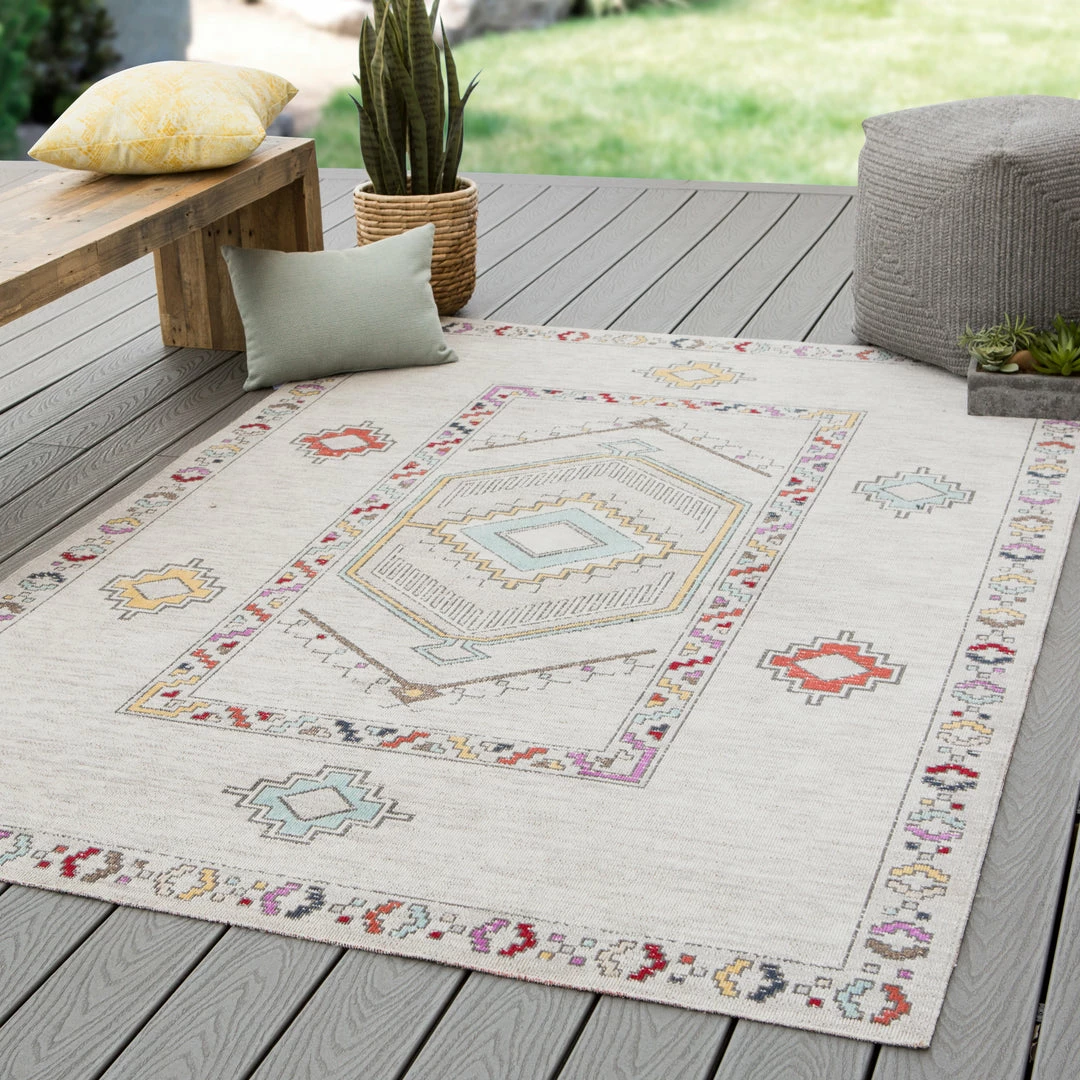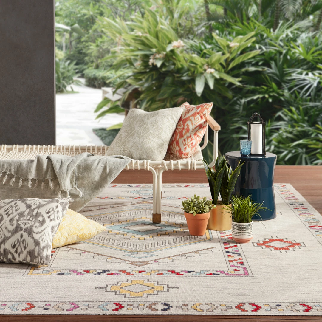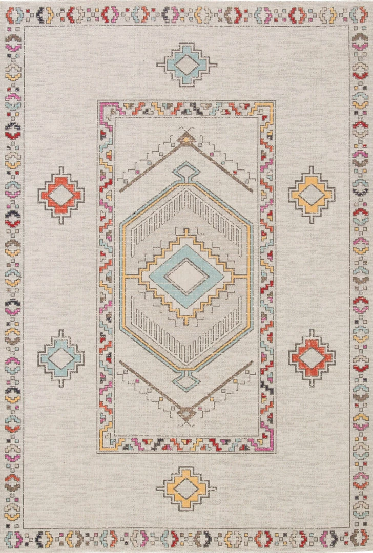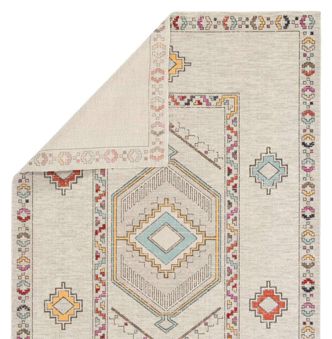 The indoor-outdoor Polaris collection combines admired traditional designs with a durable, light-weight polypropylene construction. The Tov rug is a contemporary take on a Southwestern motif with bright colors and a whimsical vibe. The heathered ivory and gray and multicolored palette highlights the geometric medallion and border design for a fun and fresh look in kitchens, living rooms, or patios.