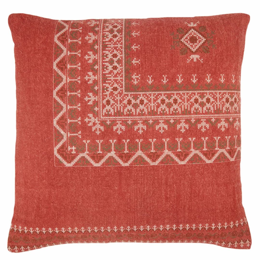 Inspired by Moroccan Sabra styles, the Puebla collection boasts vibrant color palettes and intricate tribal embroidery. The Abeni throw pillow features a vibrant red colorway with earthy brown and white details accenting the textural, cotton weave.