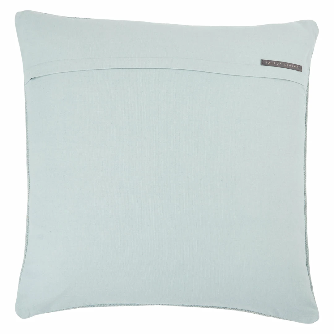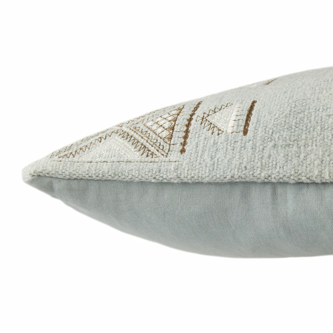 Inspired by Moroccan Sabra styles, the Puebla collection boasts vibrant color palettes and intricate tribal embroidery. The Elina throw pillow features a light, dusty blue colorway with warm brown and white details accenting the textural, cotton weave.