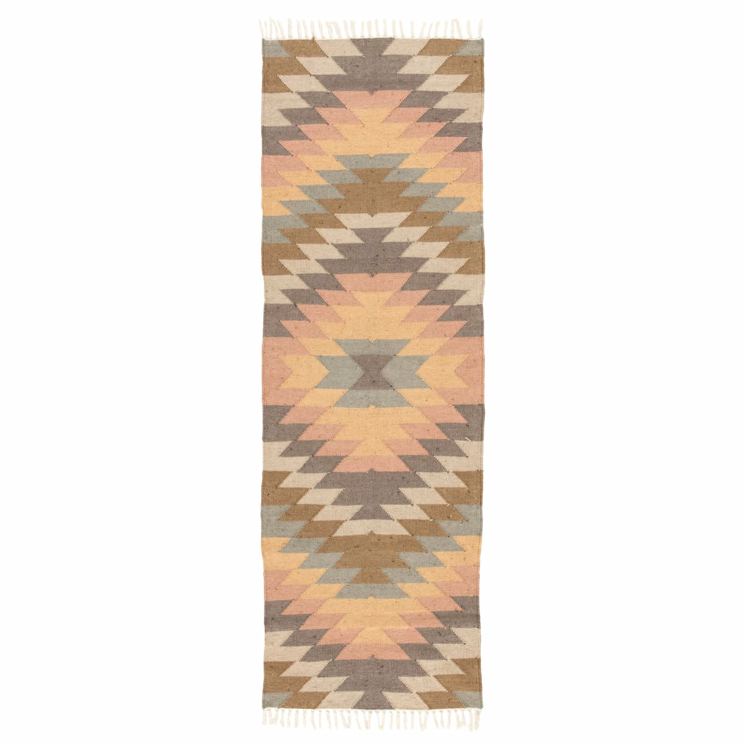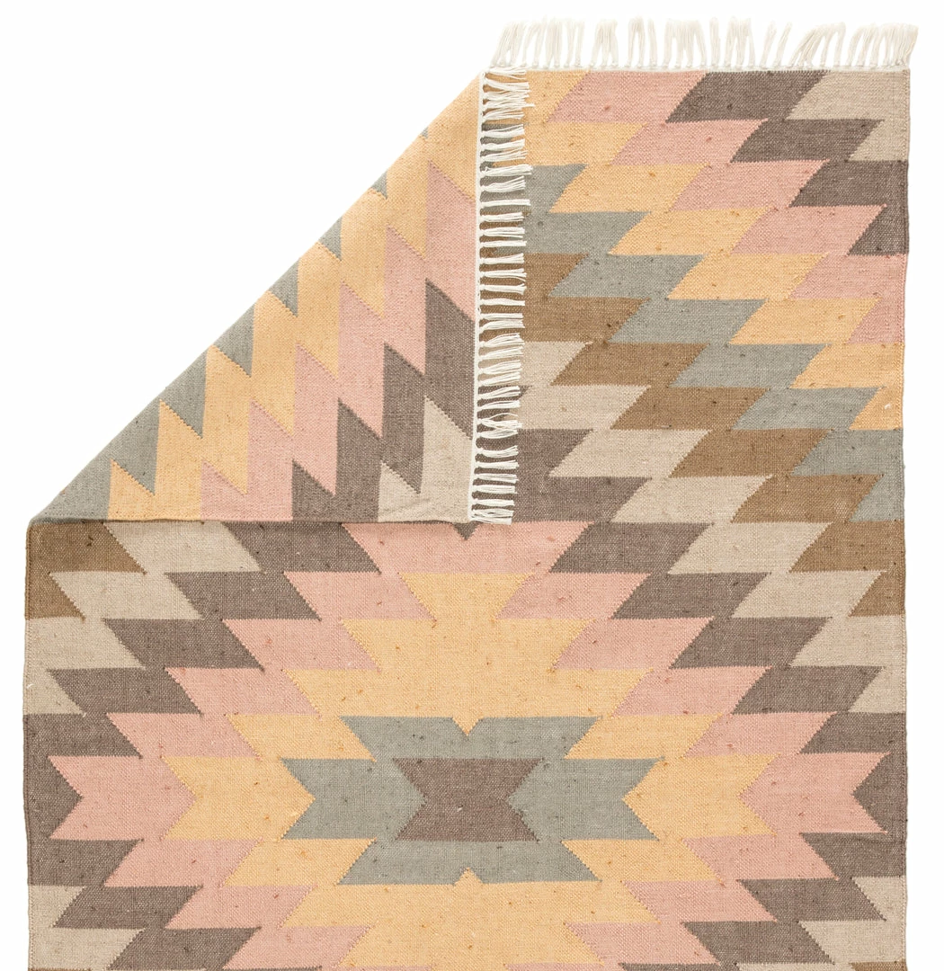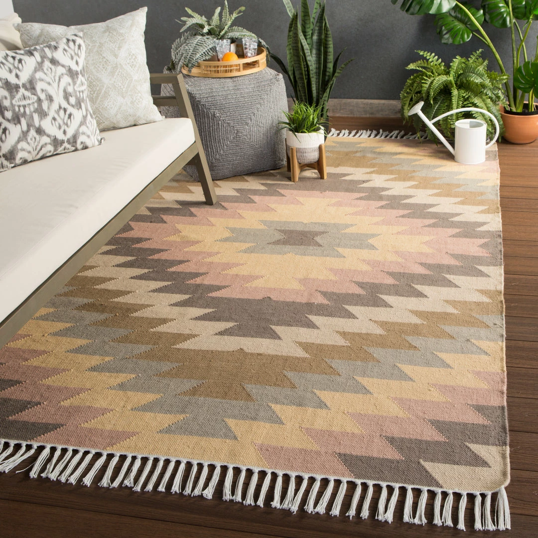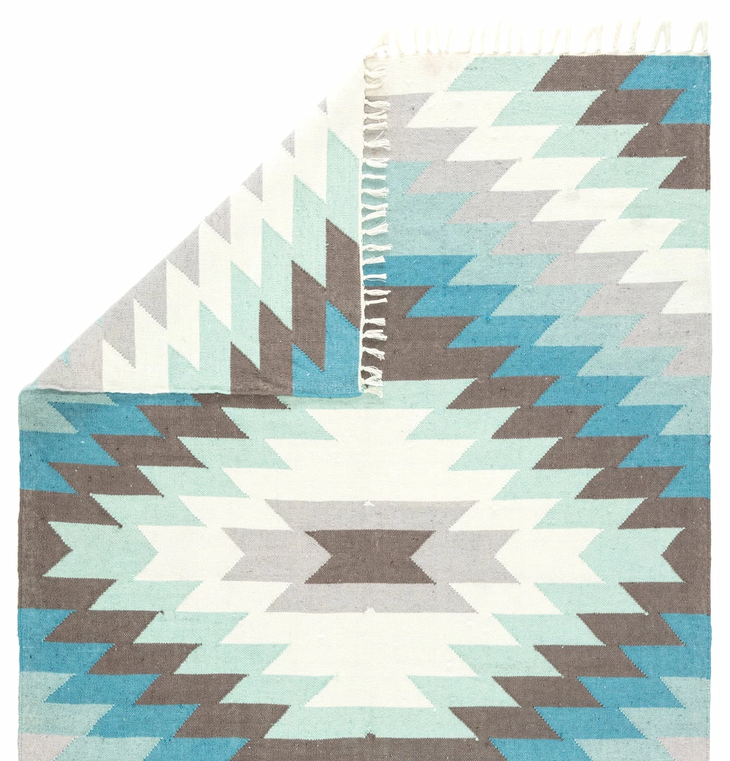 This chic indoor or outdoor flatweave rug showcases a contemporary twist on the classic kilim style. Cool-toned and vibrant hues combine to form a striking Southwestern-inspired geometric design on this durable layer, while knotted fringe trims the edges for a unique detail on a patio-worthy accent.