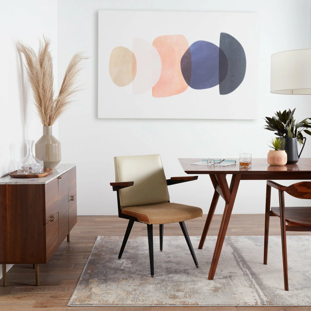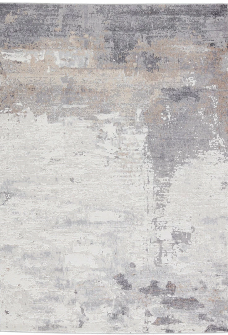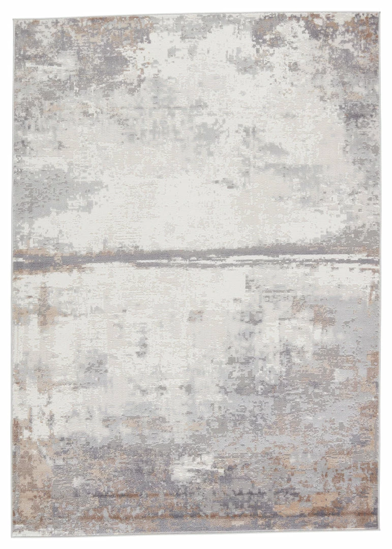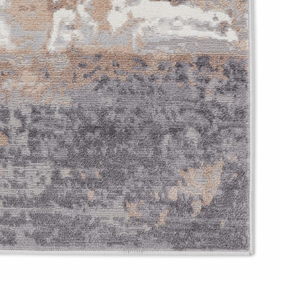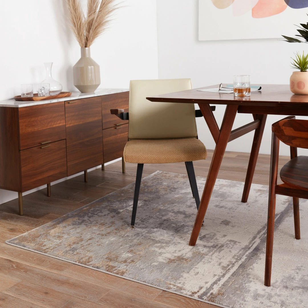The modern Grotto collection boasts a neutral palette with subtle pops of color combined with formation-like motifs. The textural yet versatile Forsythe rug grounds any space with a painterly abstract pattern in tones of gray, tan, gold, and ivory. Perfect for heavily trafficked spaces, this polyester-polypropylene blend rug is easy to clean and perfect for homes with pets and children.