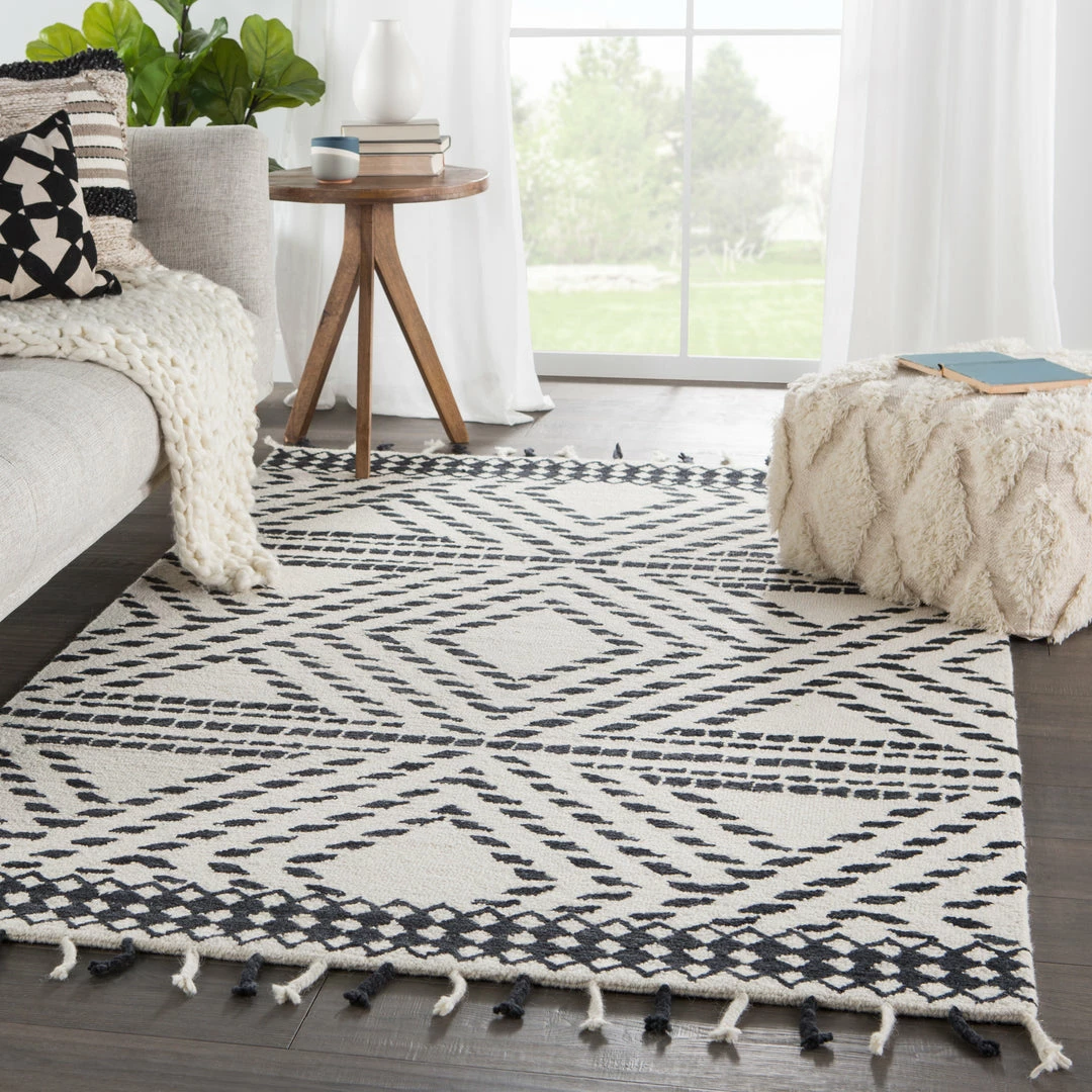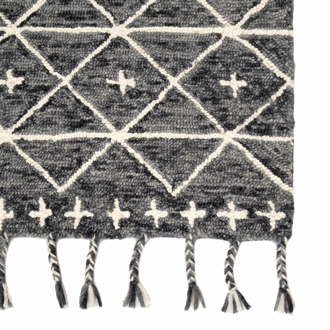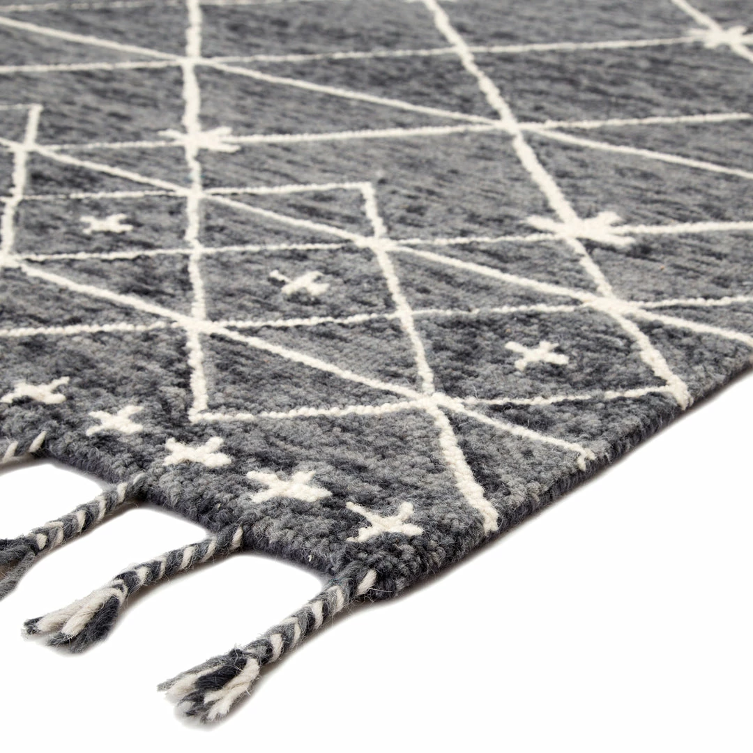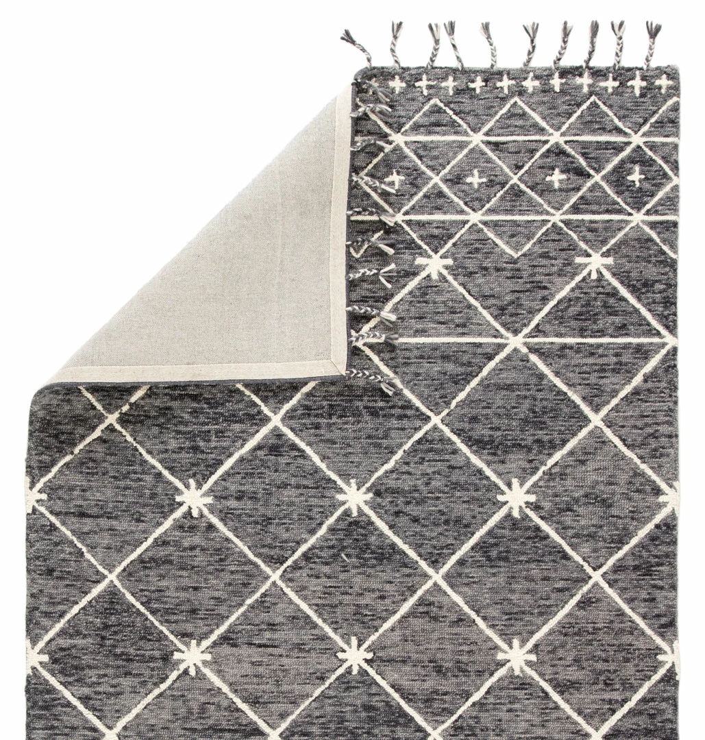 Hand tufted of wool, the Vera collection by Nikki Chu infuses contemporary spaces with inspiring patterns and versatile colorways. The glam-meets-global Rhea rug features an ivory Moroccan-inspired trellis design that covers the gray and black backdrop with a space-dyed effect. Long, braided tassels add a touch of boho-chic charm to this worldly rug.