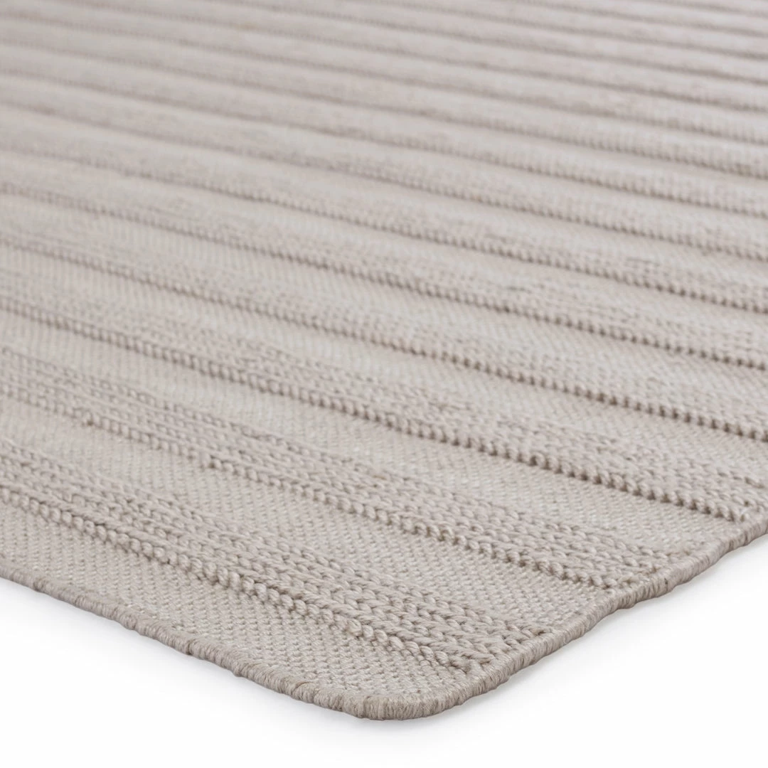 The handwoven Santa Barbara collection features a low-profile look and performance-driven quality. The Miradero area rug showcases a textural stripe design in a light gray colorway for a classic, neutral look. Crafted of PET yarn, or recycled plastic, this durable and textured rug brings warmth and inviting appeal to indoor and outdoor spaces.