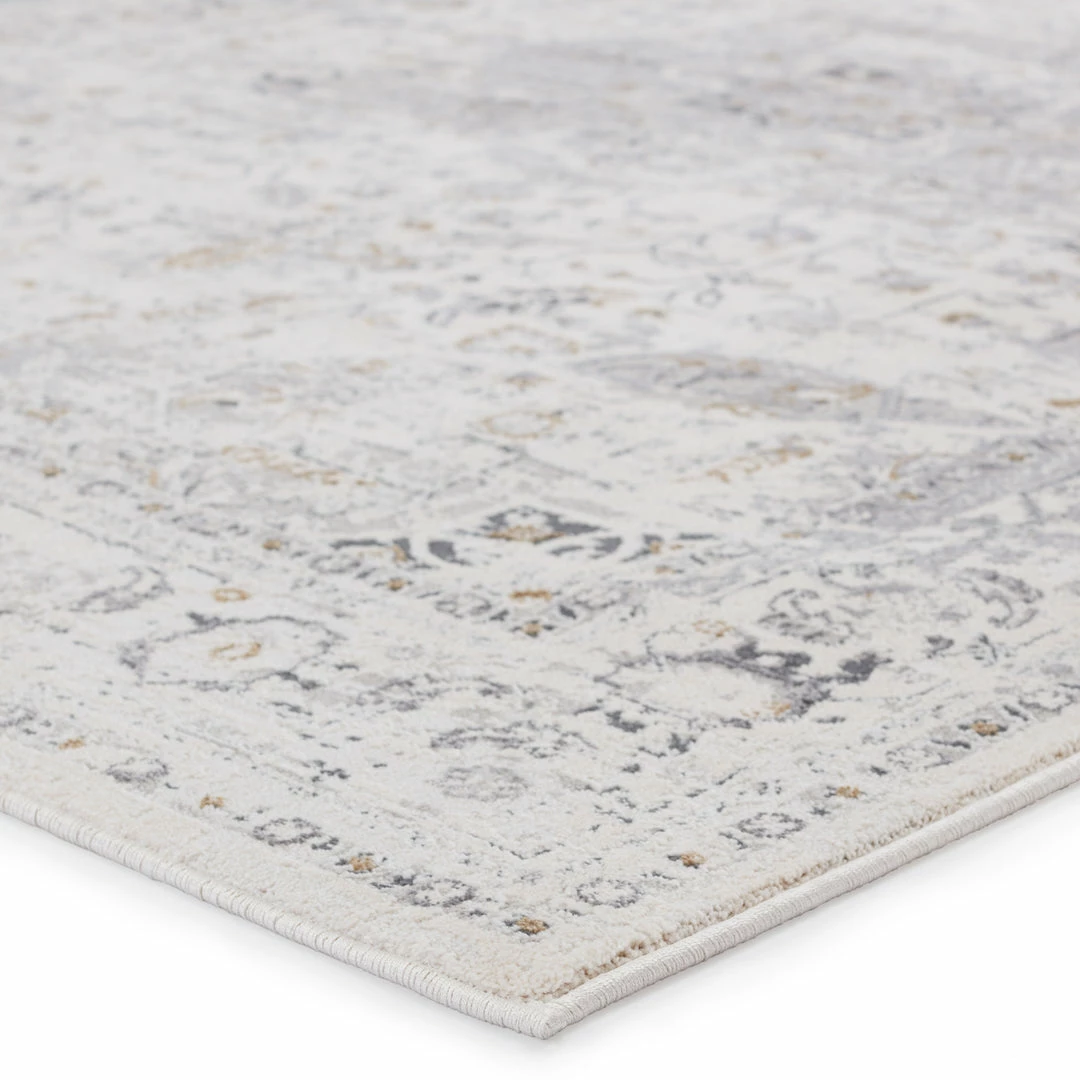 Inspired by both classic motifs and contemporary art, the Solace collection features transitional designs in soft, calming colorways. The Ellignton area rug showcases a center medallion with elegant floral details in serene, relaxed hues of gray, ivory, and subtle hints of gold. Made to withstand heavy foot traffic and lived-in spaces, this power-loomed polypropylene rug boasts texture-rich high-low pile.