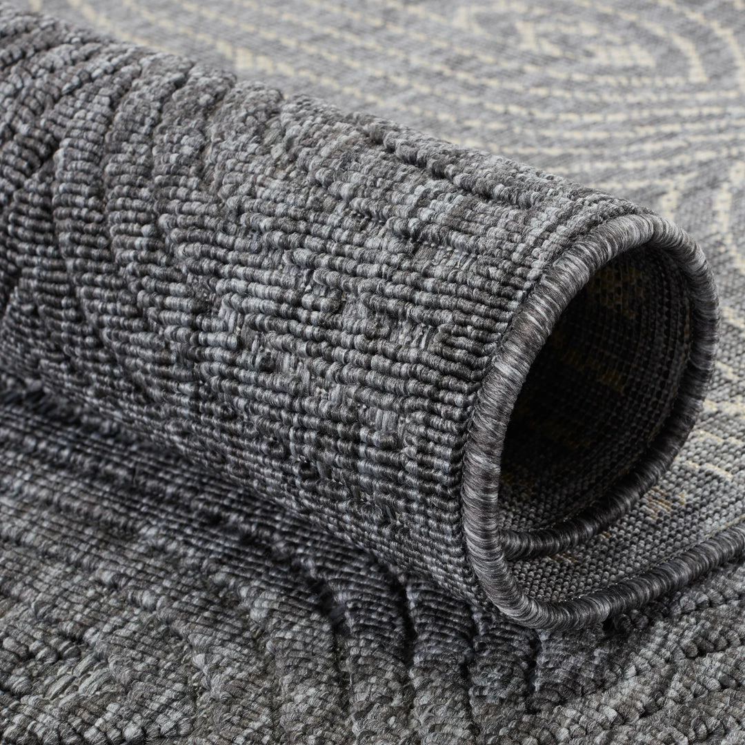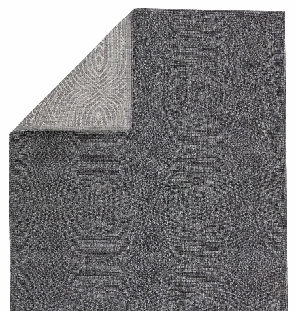 The bold yet perfectly versatile Tajiri collection by Nikki Chu pairs perfectly with outdoor seating and dining sets. Large-scale global motifs make a statement, while the neutral colorways anchor any space. The black and dark gray Ekon rug features a captivating repeat pattern with linear details. A combination of looped and flatwoven polypropylene pile adds depth and dimension, not to mention a durable layer underfoot.