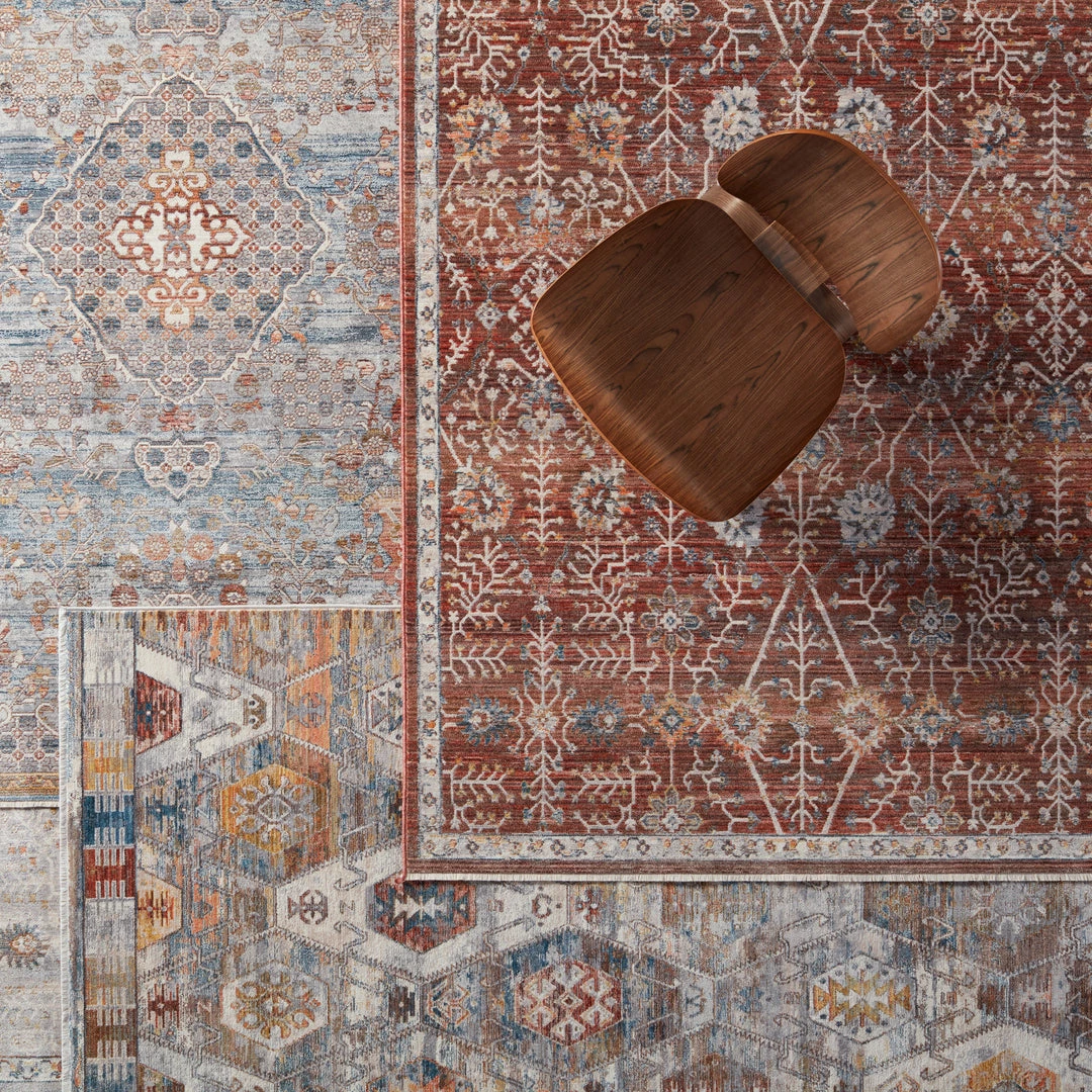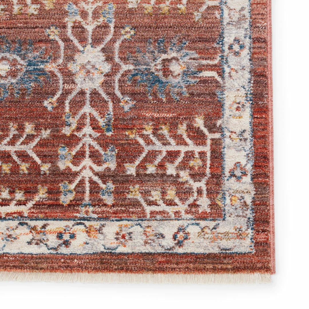 A complementary mix of vibrant and natural tones combine to create the effortlessly stylish Terra collection. Space-dyed polyester lends a unique colorway and subtle, dimensional sheen to the stunningly detailed design. The eye-catching and vintage-inspired Katalia rug offers a pattern-rich accent with a detailed floral vine motif in mixed hues of red, blue, yellow, gray, ivory, and deep plum.