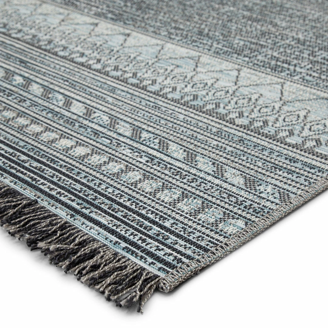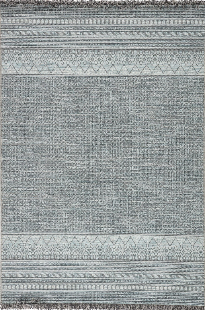With an assortment of relaxed, bohemian designs, the Tikal collection is the perfect weather-resistant and stylish accent for outdoor and indoor settings. The flat-woven Ravi rug features a pattern-rich tribal border that frames a heathered center and chic fringe for added texture. The gray and light blue colorway offers a versatile decorating palette to any space.