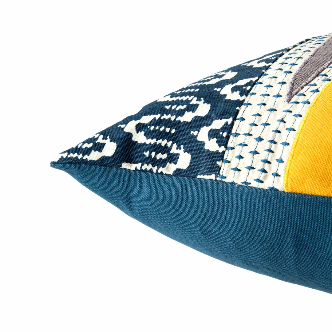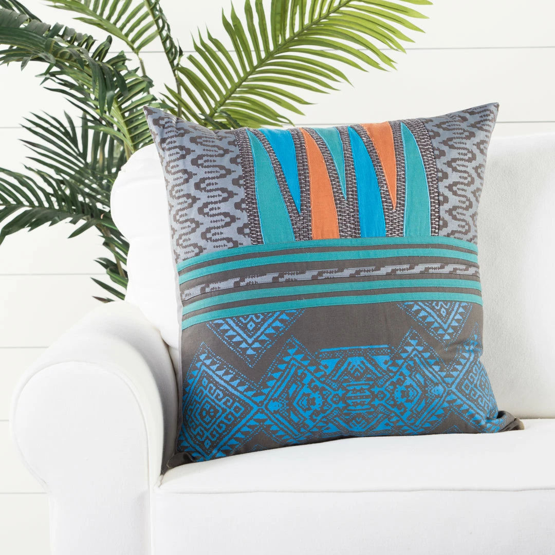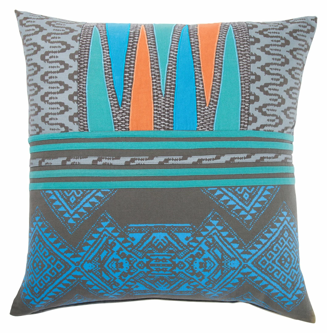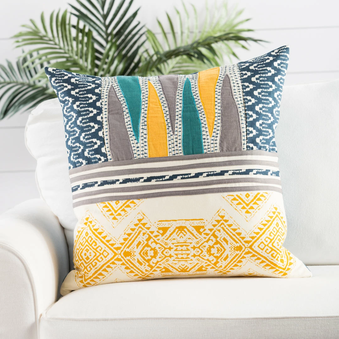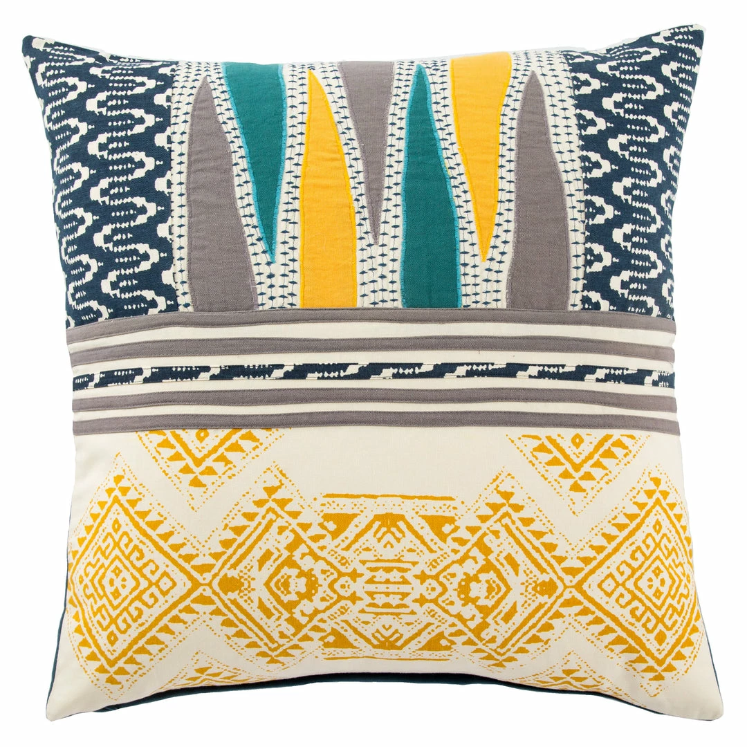 Tribal patterning with a contemporary twist defines the chic and playful style of this geometric throw pillow. Bold details of triangles, stripes, and diamonds combine in vibrant hues of teal and yellow on this cotton cushion.