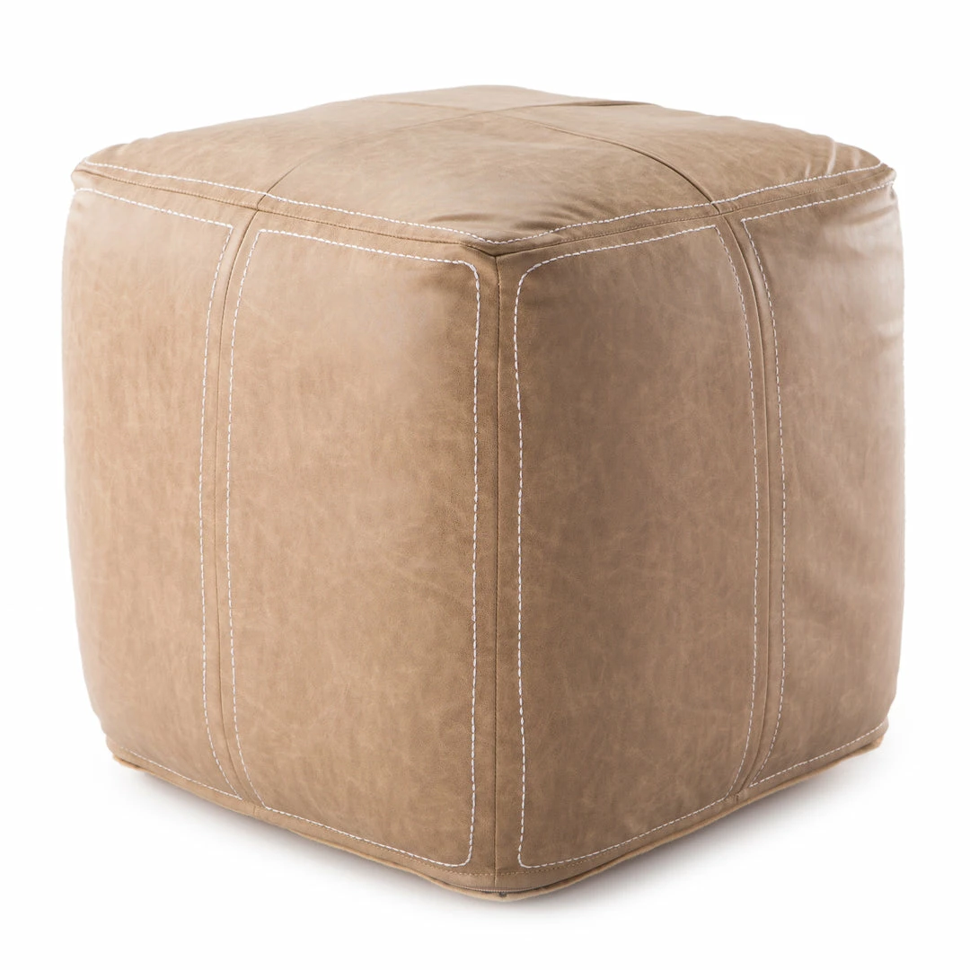 Sleek and warm in the same moment, this Nikki Chu pouf offers minimalist charm to modern spaces. Baseball stitching adds tailored detailing to the camel brown faux leather, lending a subtle quilted design to this square accent.