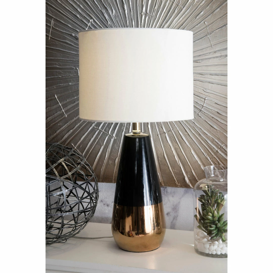 Modern and mid-century, this delicately styled table lamp instantly adds elegance to your surroundings. The base is with gold and capped by black ceramic as if dipped gently in the gold.
