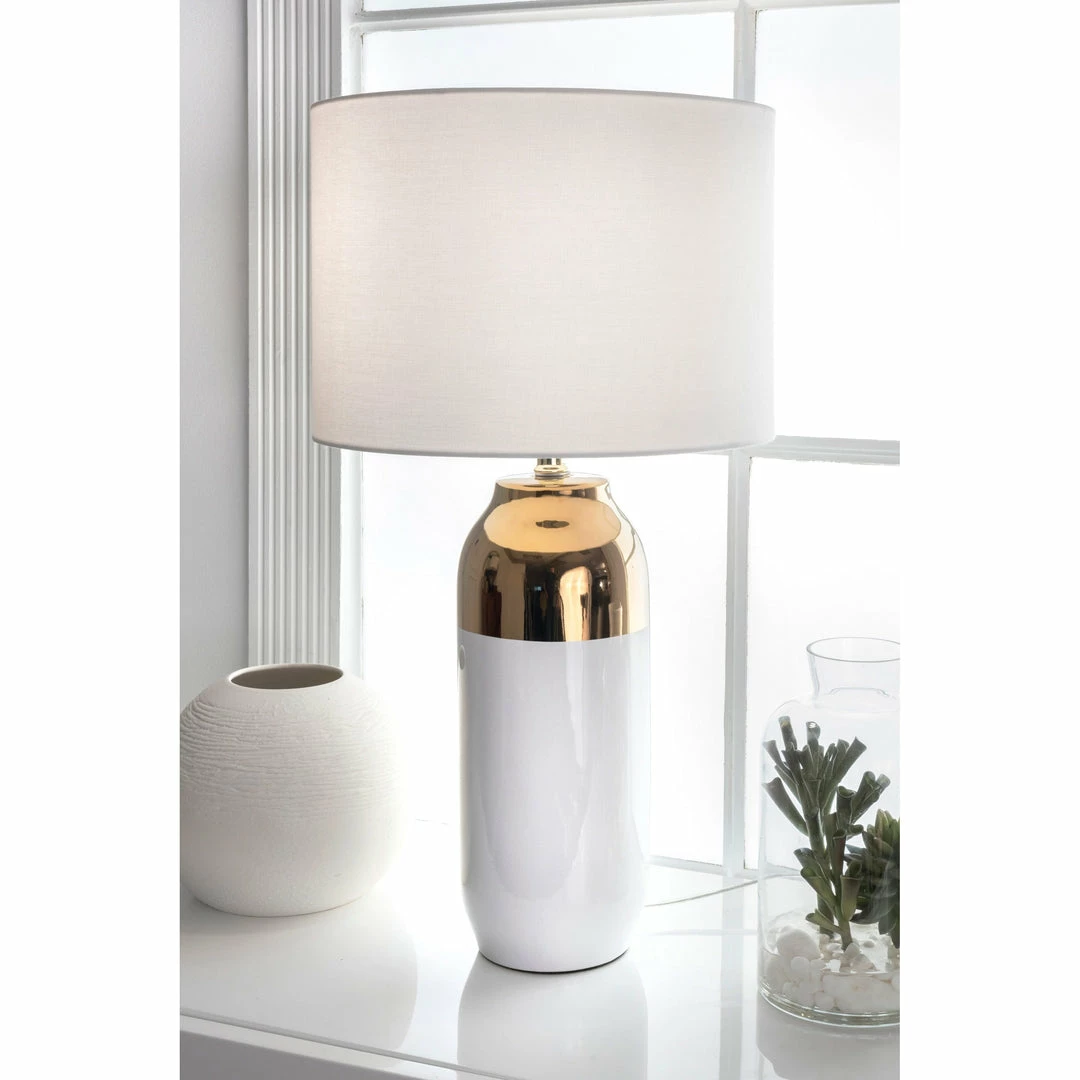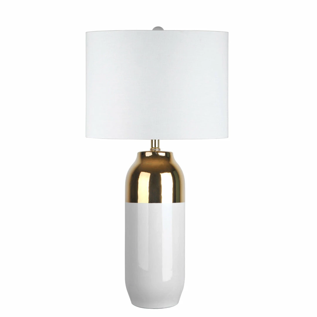 Modern and mid-century, this delicately styled table lamp instantly uplifts your surroundings. The frame is accented by a brass cap accenting a pill-shaped white ceramic base.