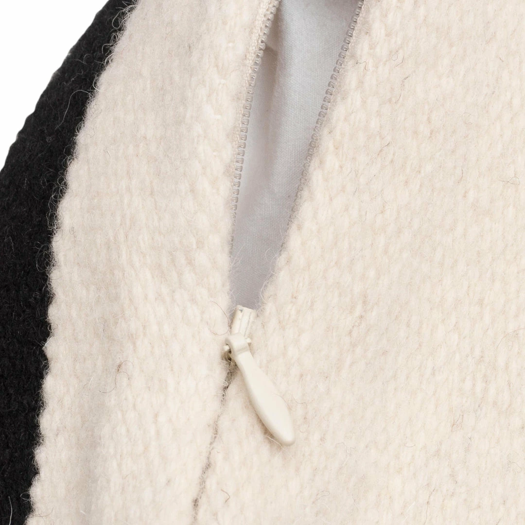 Between stripes, an intricate diamond pattern is formed by smaller black geometric motifs. Peruvian artisan Cerapio Vallejo works on a traditional handloom to weave this cushion cover from wool. One one side, this cover opens with a zipper for inserting a cushion.