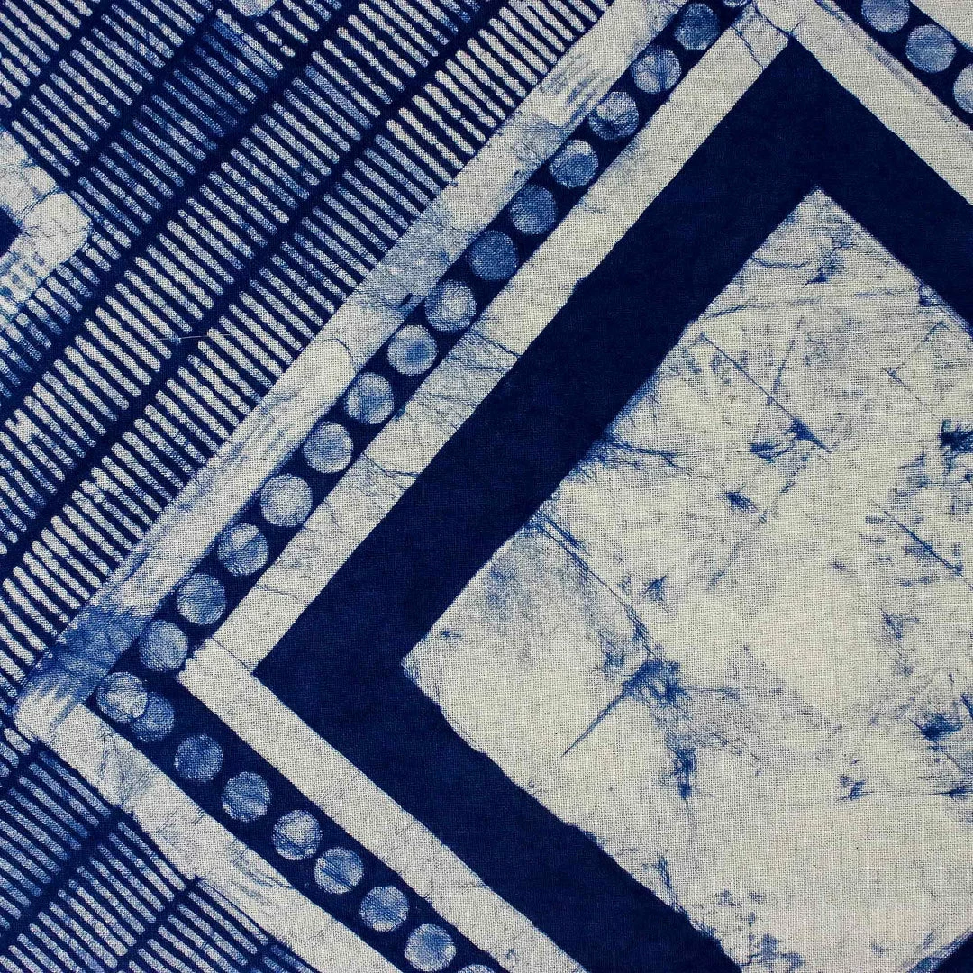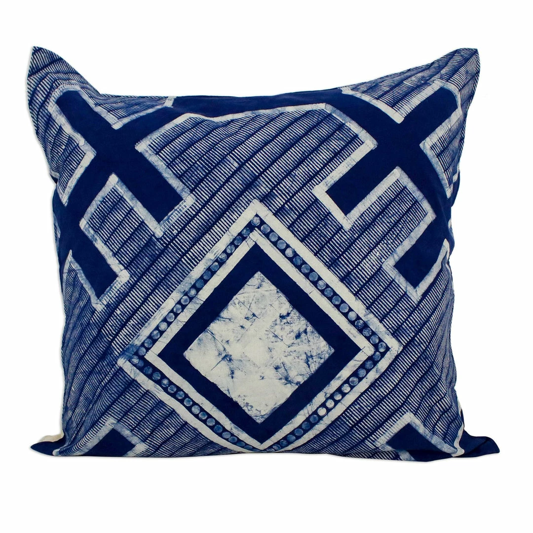 Crafted using traditional batik methods, this square cushion cover makes a striking accent in any setting. The all-cotton cover is hand-painted with patterns in wax before being dyed a deep indigo color. Designed by Simone Buys, the cover features a solid natural cotton back with a slit for the insertion of a cushion.
