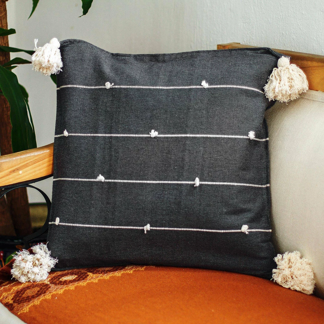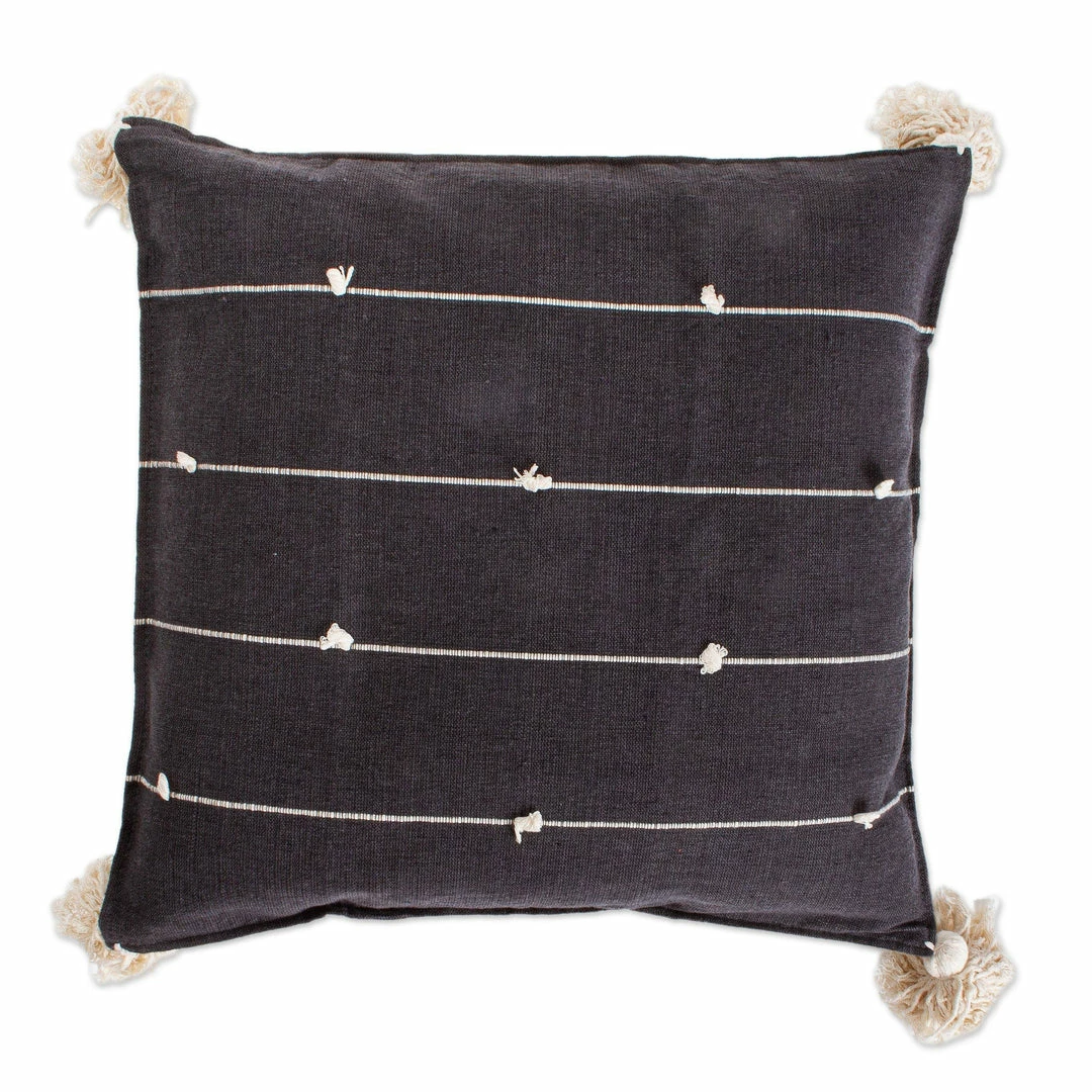 Cotton threads of eggshell and black are woven together to create this grey pillow from Mexico. Margarita Ruiz crafts the pretty cover, which is woven on a traditional pedal loom.
