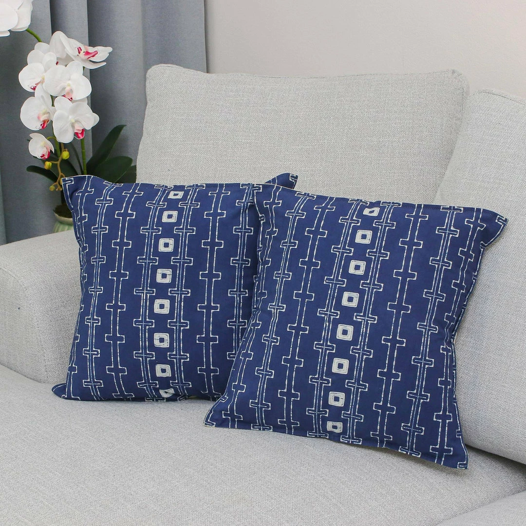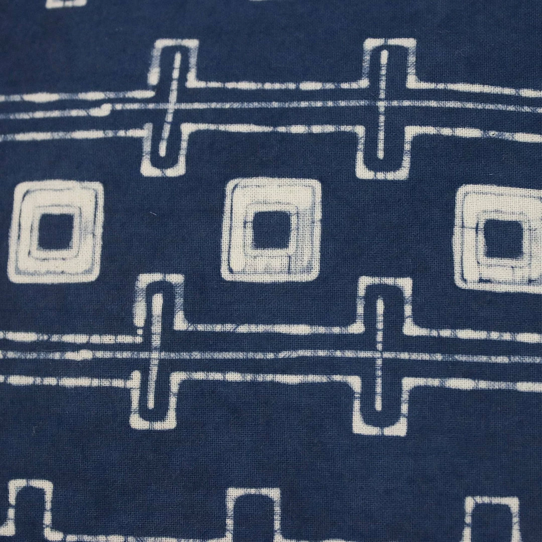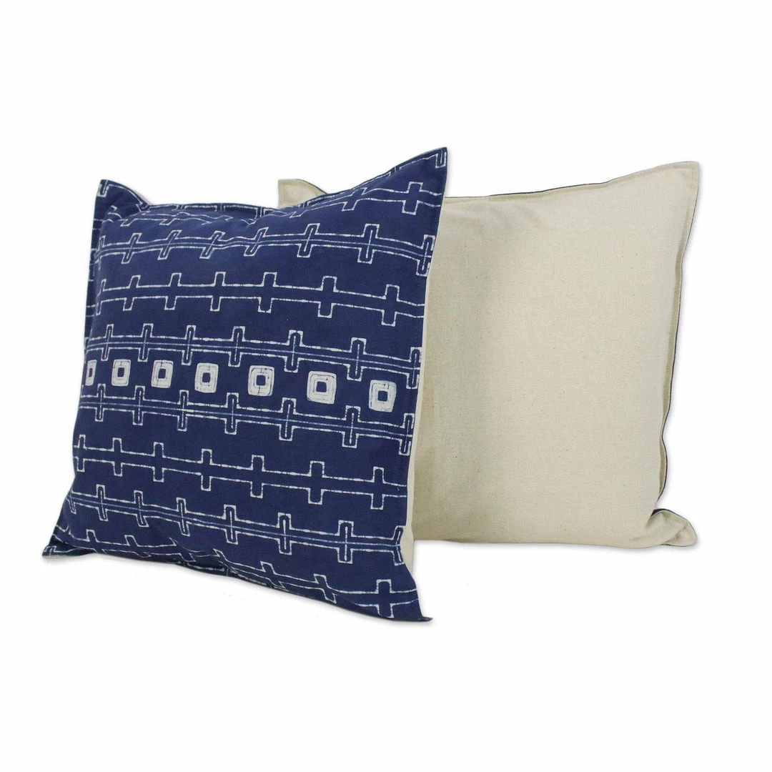 The indigo designs are achieved with the batik technique, where a wax resist is applied to the fabric before it is submerged in dye. Each reveals a neutral back with a slit for inserting a cushion.
