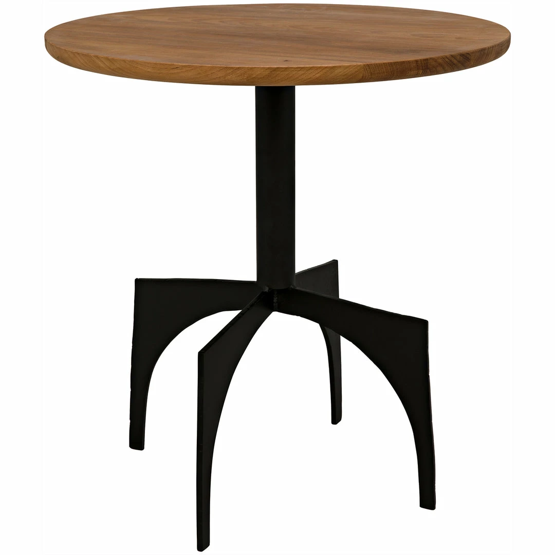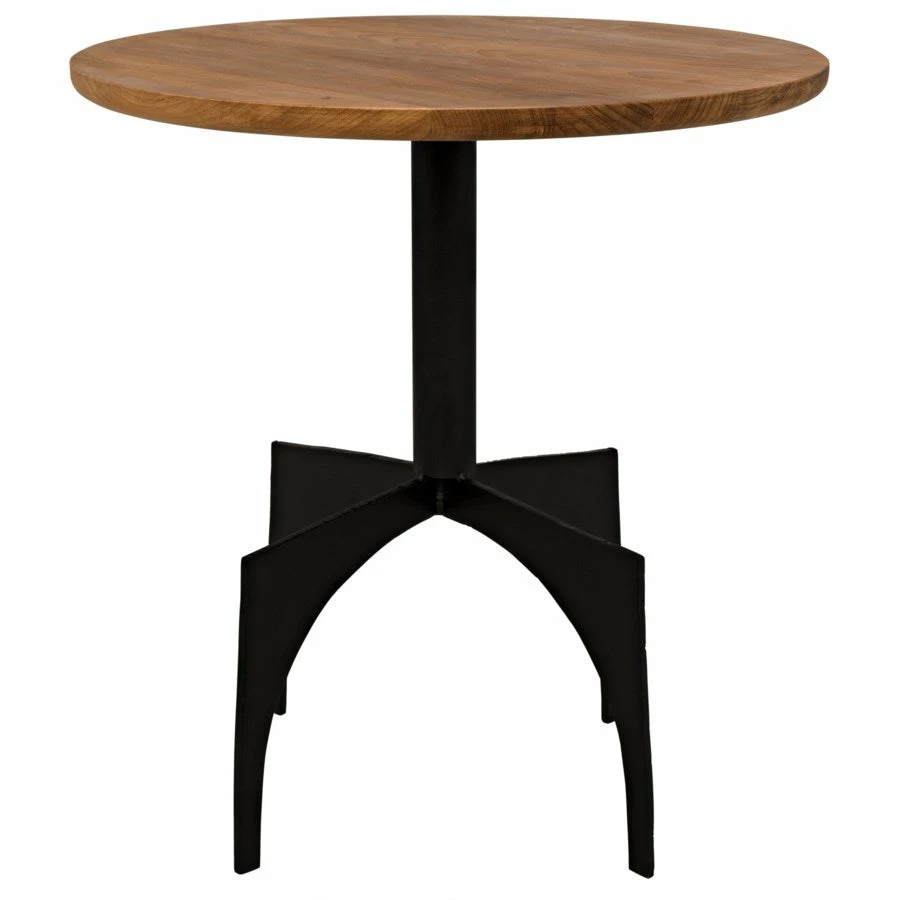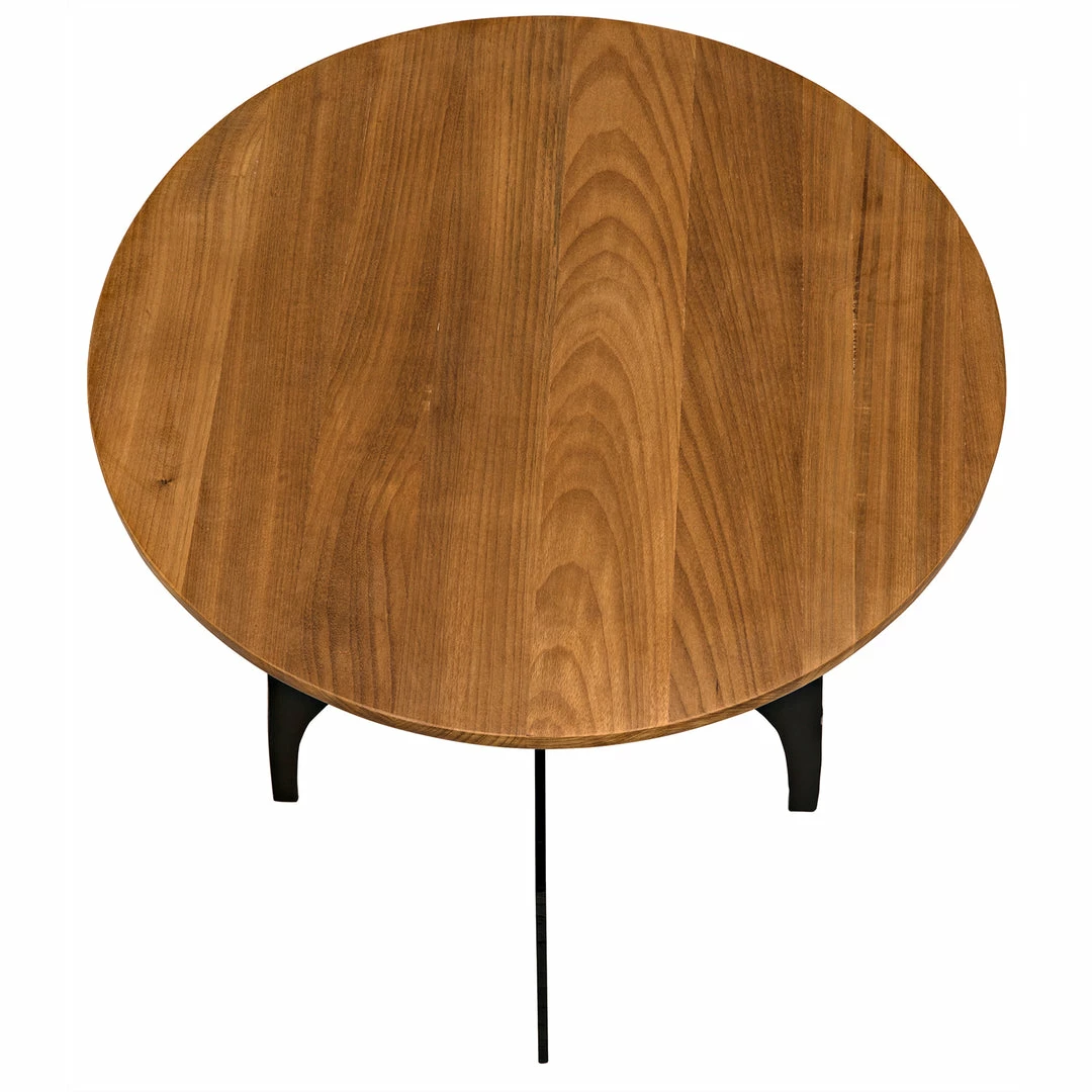 Mid-century modern in feel, this striking side table features a seemingly aerodynamic metal base. The cool metal contrasts beautifully with the top-A simple round of expertly finished gold teak.