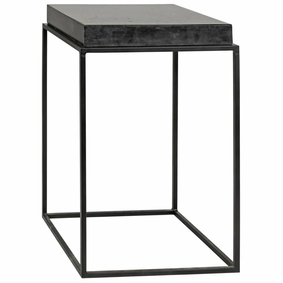 Slim, seemingly delicate bands of metal gracefully support a square black marble top in this striking side table. The metal is given a minimally finished appearance to perfectly complement the deep black stone, which rest gently atop the open cuboid base.
