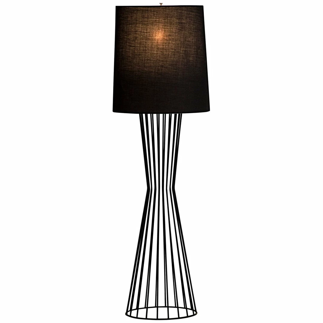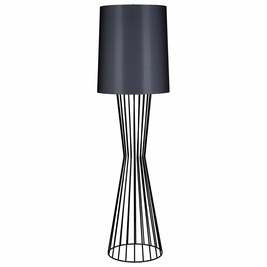 A tapered matte black metal cage narrows as it rises from the floor, then widens again to meet a tall black drum shade that filters the light from a 60W bulb.
