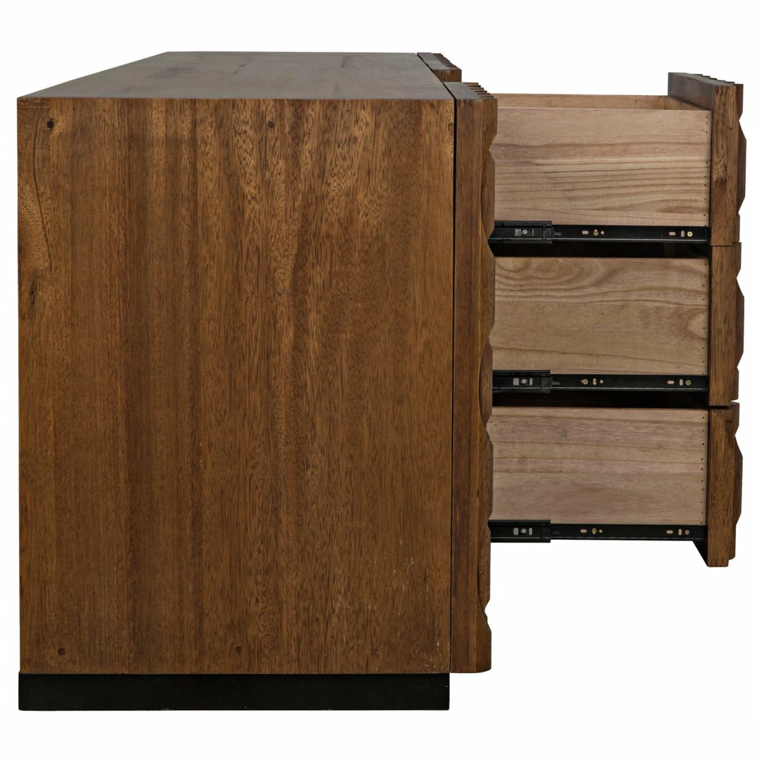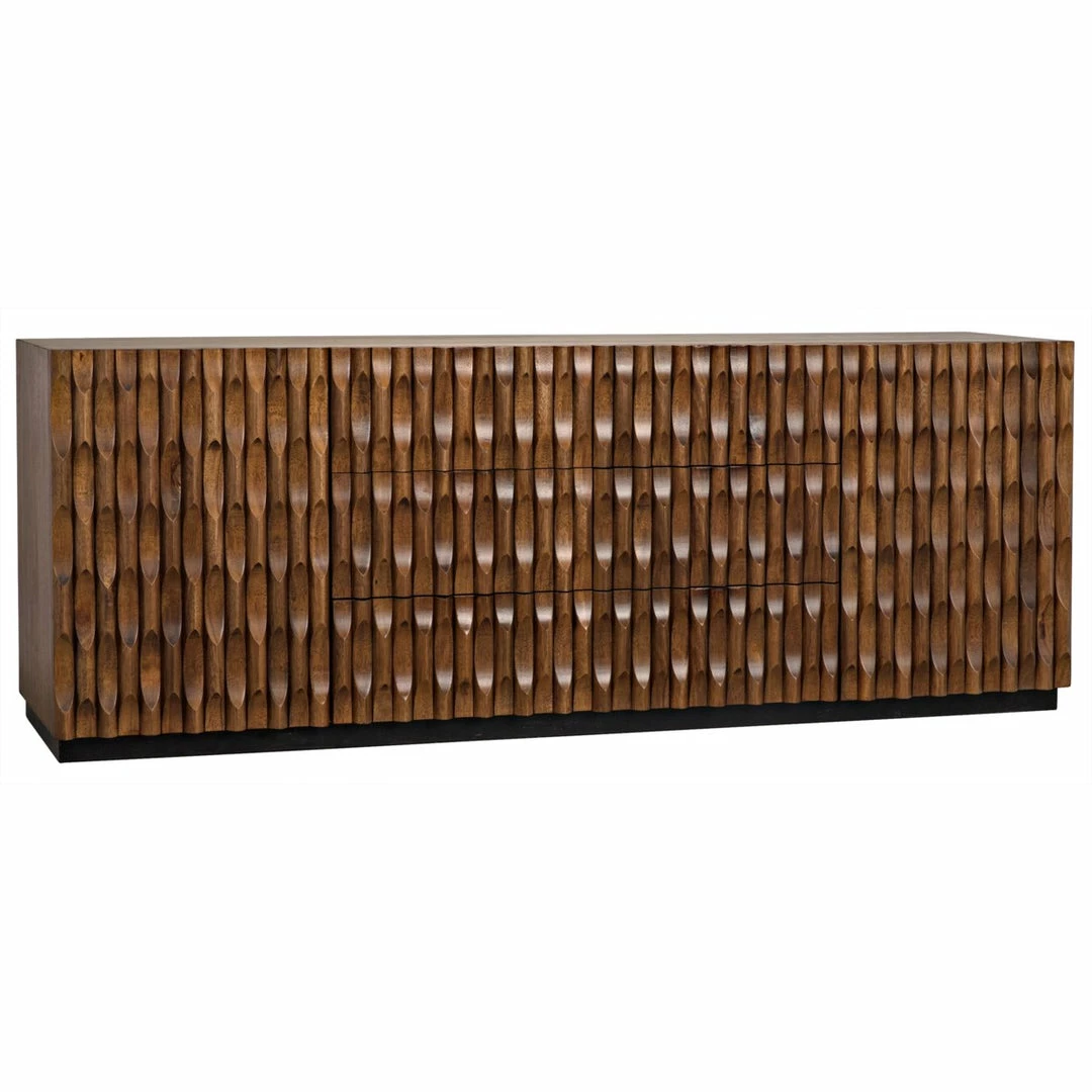 Intricate hand-carved embellishments adorn this gorgeous walnut sideboard. Finished in a rich, hand-applied dark stain, the carvings conceal generous cupboards for stashing necessities.