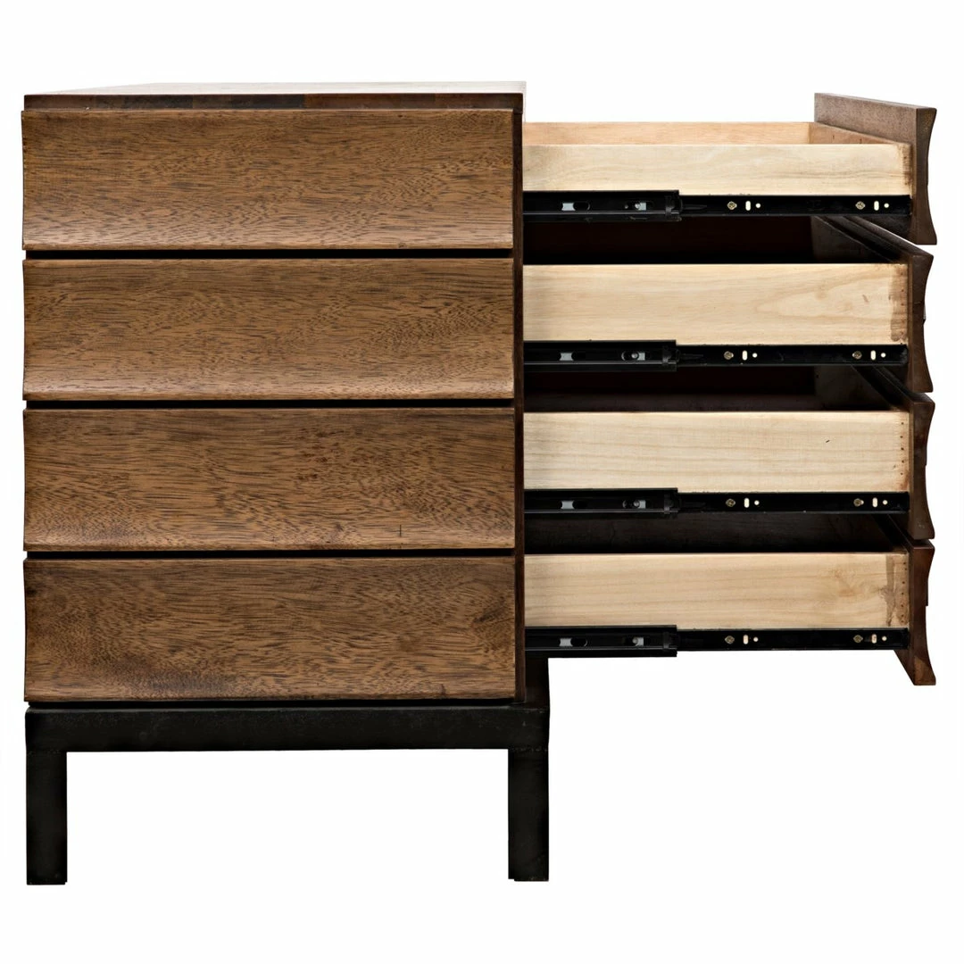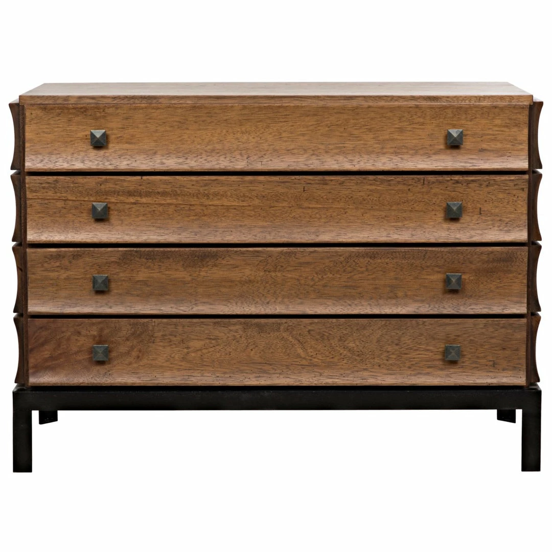 Asian inspired lines enhance this lovely four drawer chest. Hand-carved of walnut with a rich dark finish, square metal pulls and a simple metal base add a touch of strength that beautifully complements the warm of the of the wood.