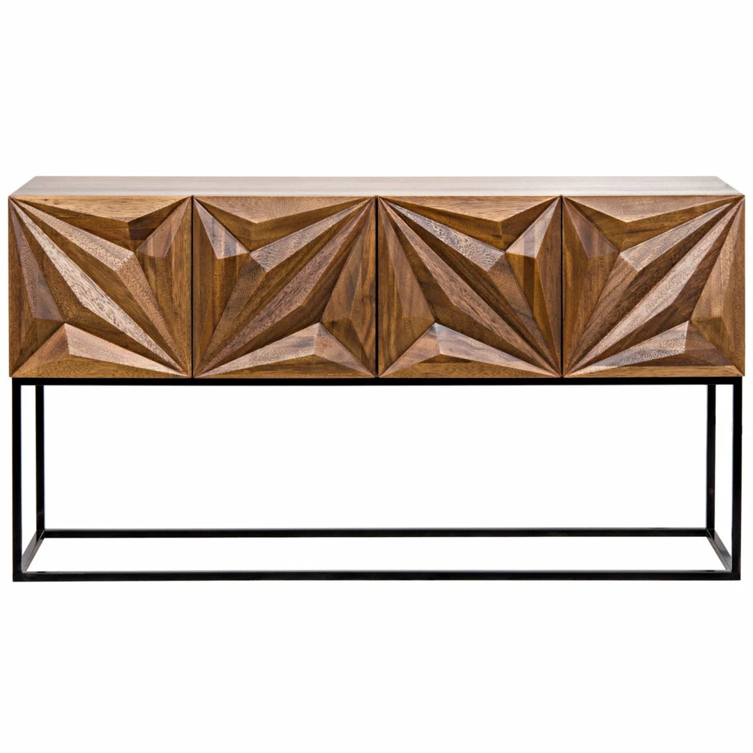 Stunning in its simplicity, this solid walnut sideboard rests atop slim metal legs. Each of its four doors is beautifully hand-carved with bold diamond and rhombus patterns. Open, they reveal generous interior storage. Simplicity, perfectly rendered.