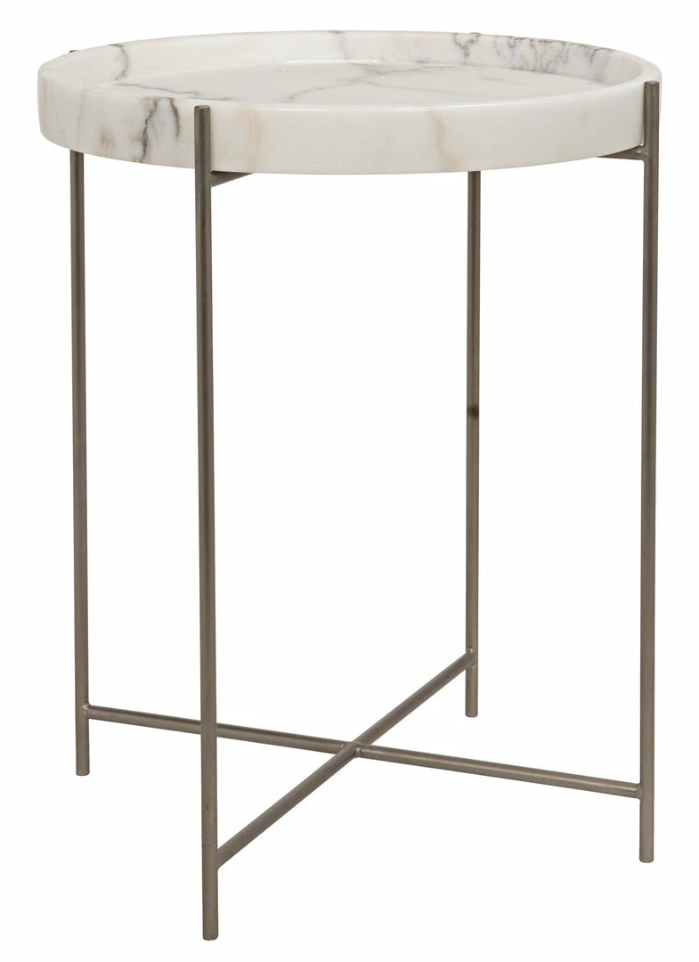 Slim, seemingly delicate bands of metal gracefully support a marble top in this lovely table. The metal is given a softly burnished silver finish to complement the clean white of the natural stone. No two pieces of stone, and therefore no two tables, will be identical.