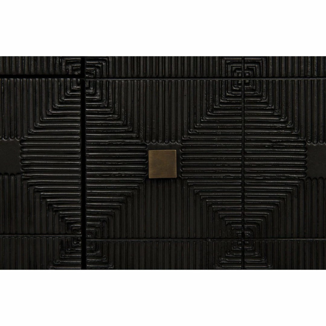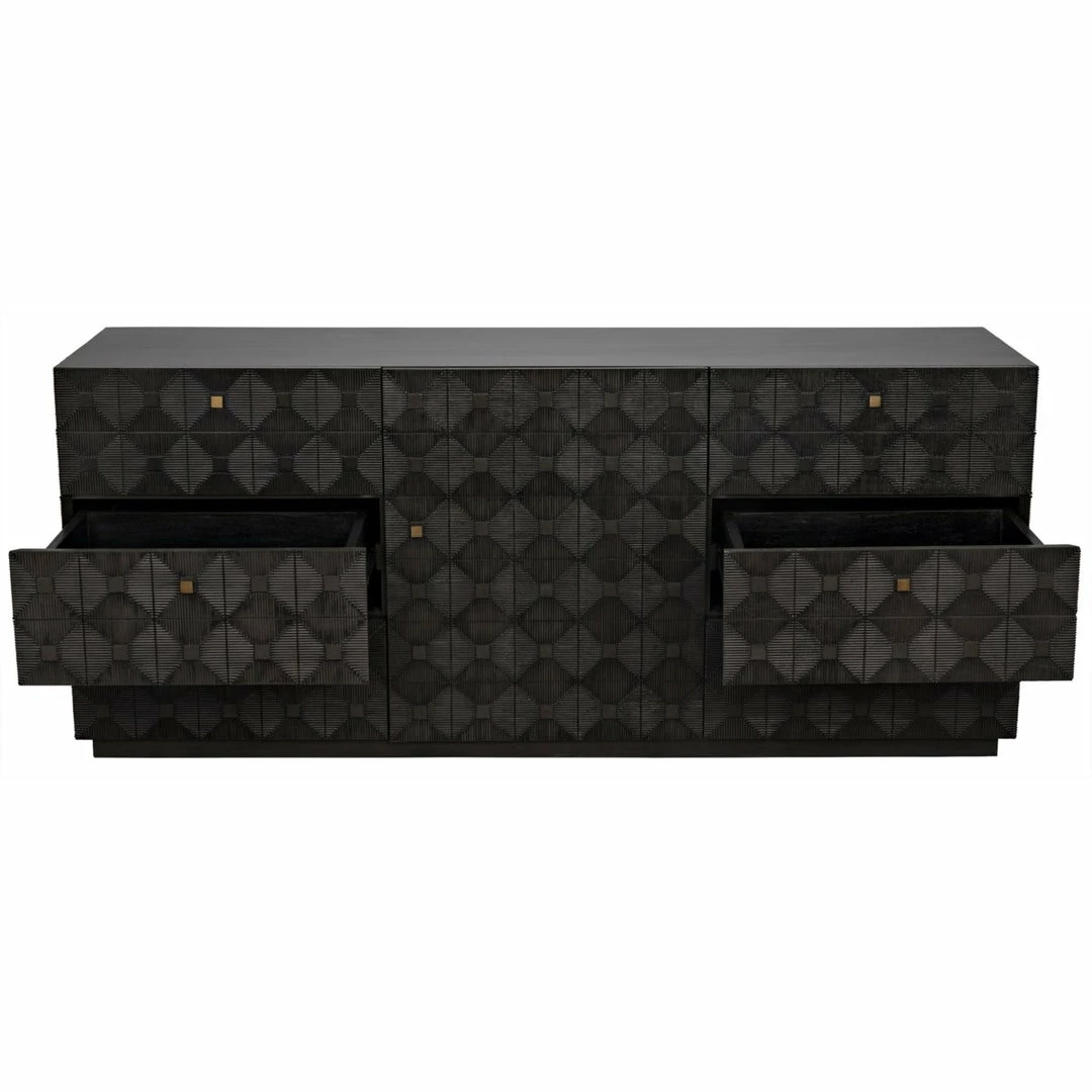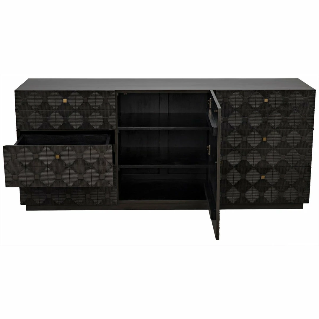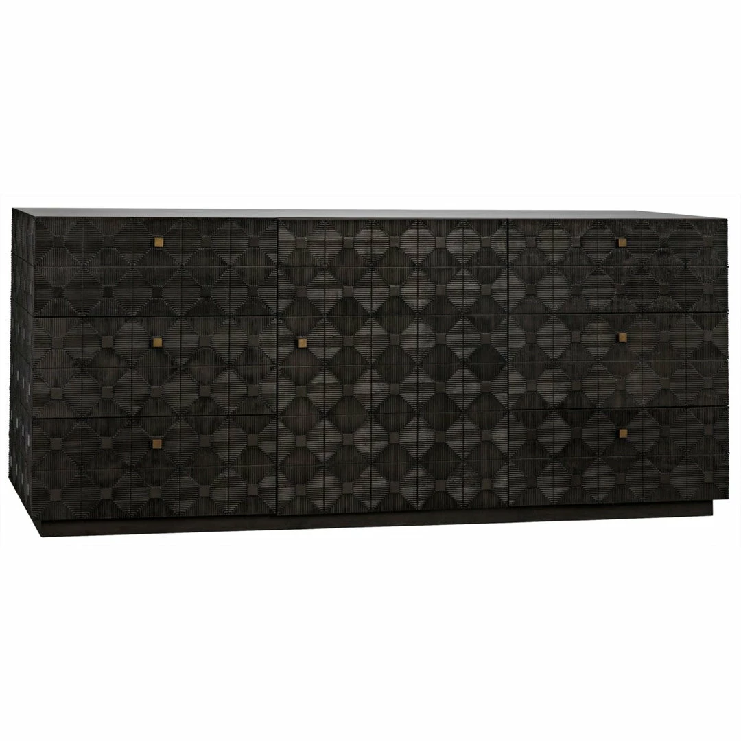Carved of the most revered hardwood, mahogany, three sides of this exquisite dresser are adorned with decorative geometrical patterns. Its central cupboard opens to reveal three shelves, and is itself surrounded by six generous drawers.
