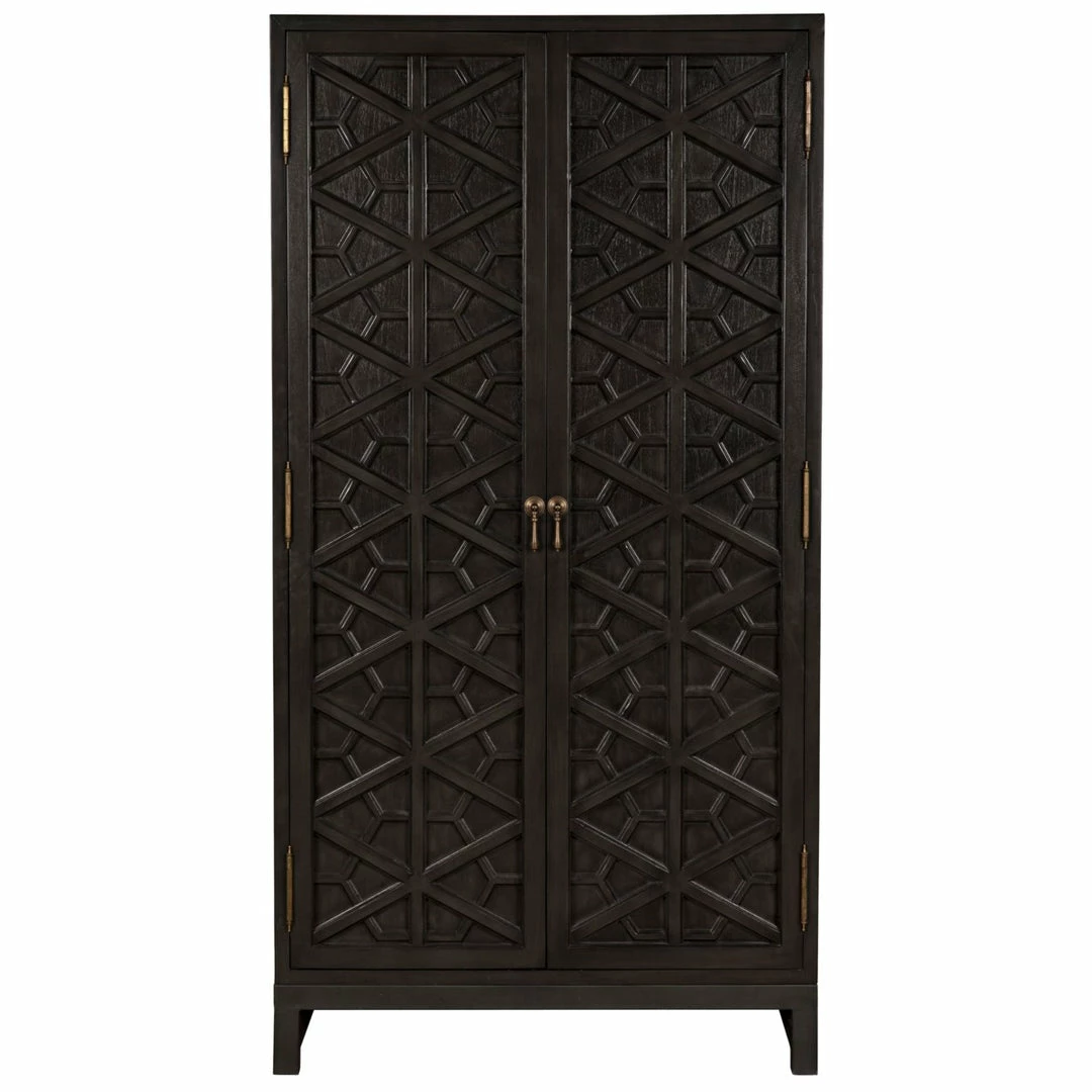 This carved mahogany hutch, at nearly eight and a half feet tall, is sized to make a statement! A favorite of our lead designer who, to let the carvings shine, kept the rest of the design simple with metal pulls, a neutral finish, and simple metal base.