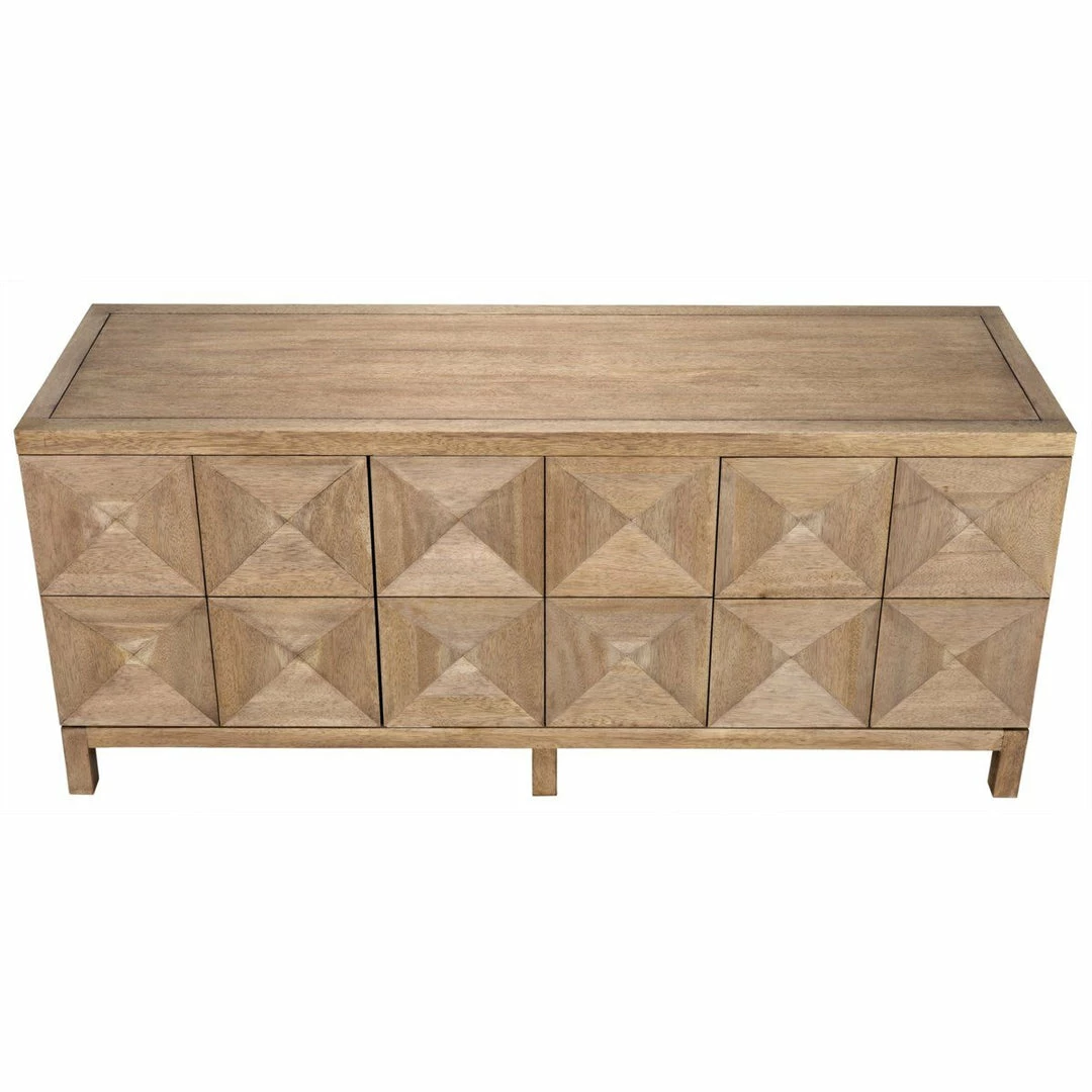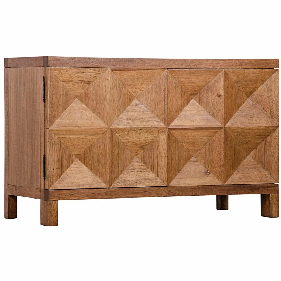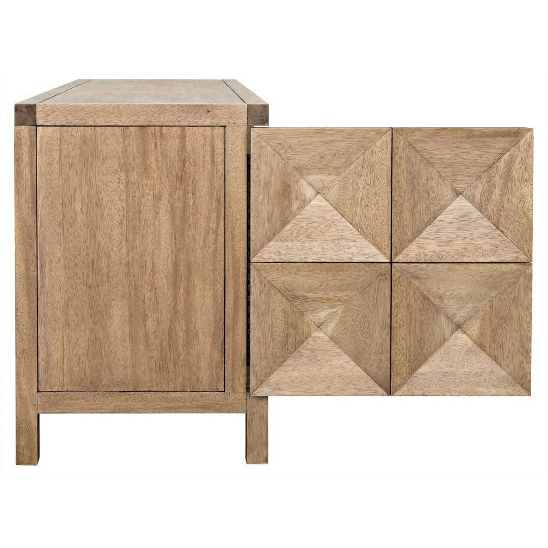 This classic yet contemporary design features three geometrically carved doors that open via hidden push latch to reveal two large interior cupboards. Artisan crafted and finished without sealer, the walnut receives a coat of wax, allowing the table to age naturally over time.