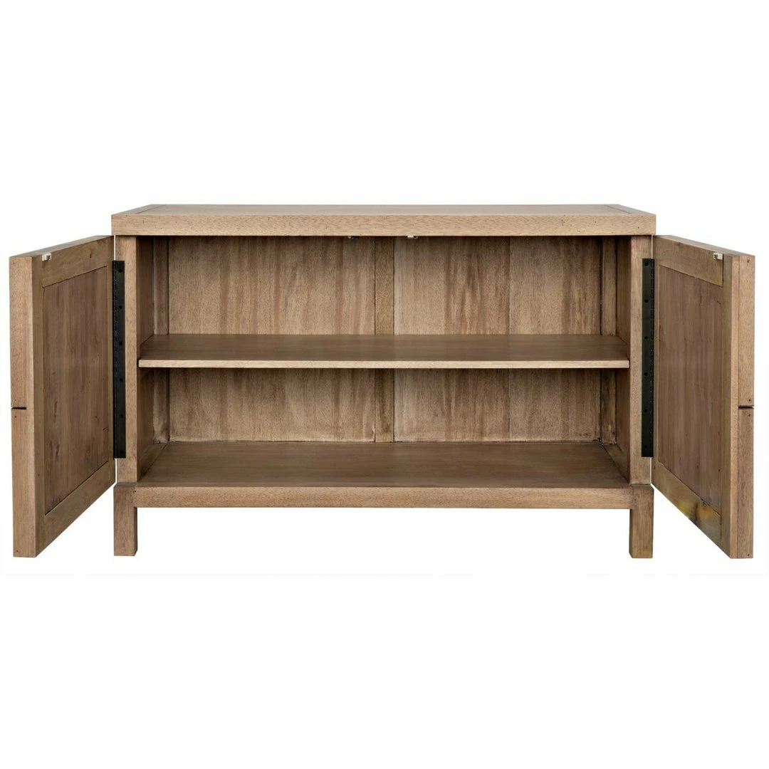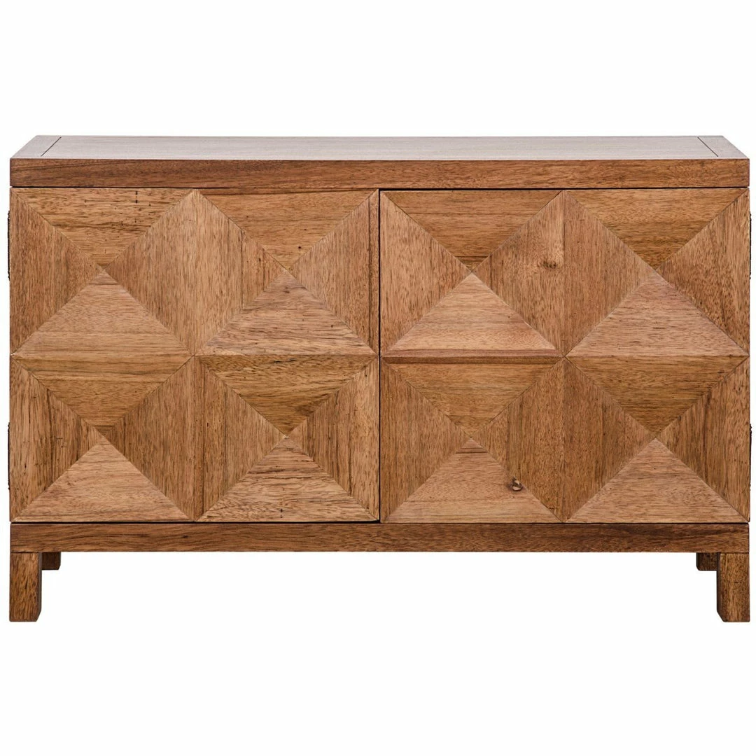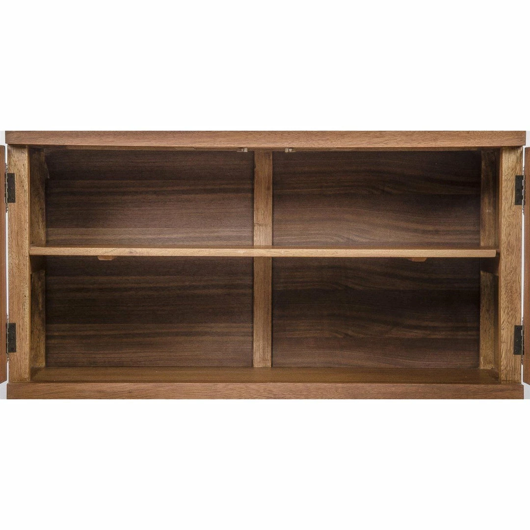 This classic yet contemporary design features three geometrically carved doors that open via hidden push latch to reveal two large interior cupboards. Artisan crafted and finished without sealer, the walnut receives a coat of wax, allowing the table to age naturally over time.