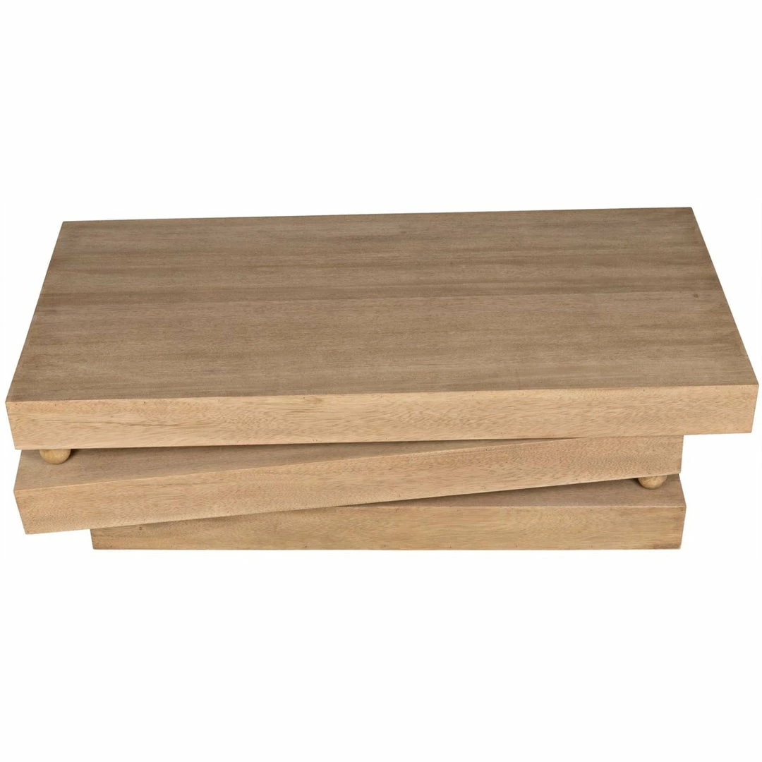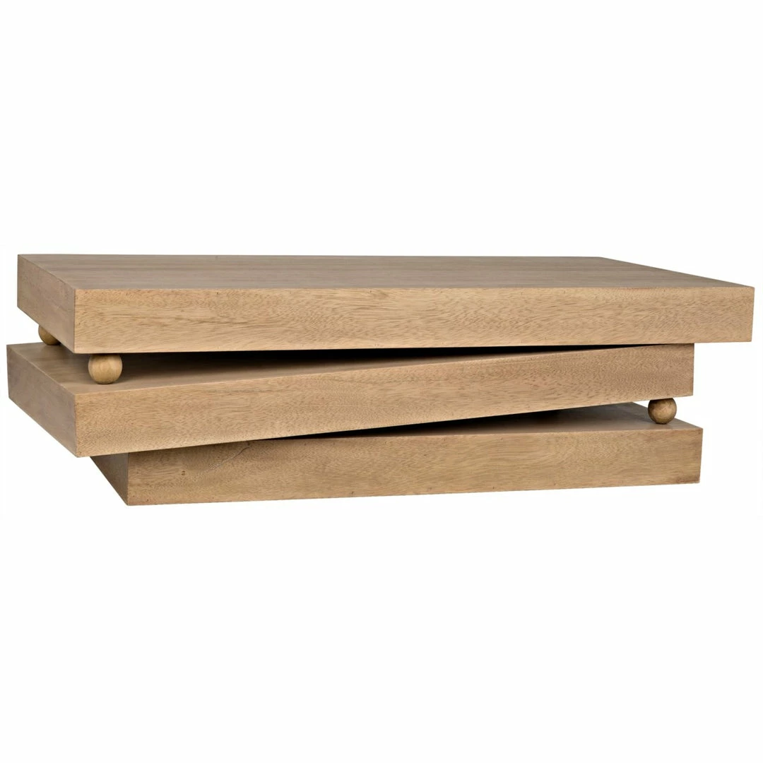 Three solid slabs of walnut are piled, seemingly precariously, in this whimsical design. A washed finish adds a touch of sophistication, and small wooden balls between the layers add additional interest.