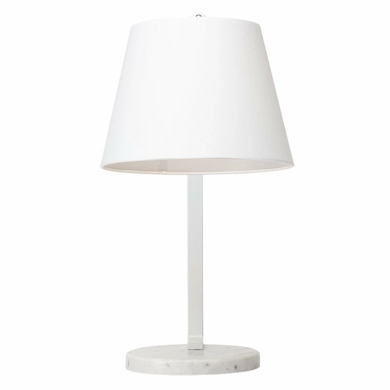 The minimalist table lamp recalls iconic European designs of the early 1970s, emphasizing a pared down lean modern aesthetic.
