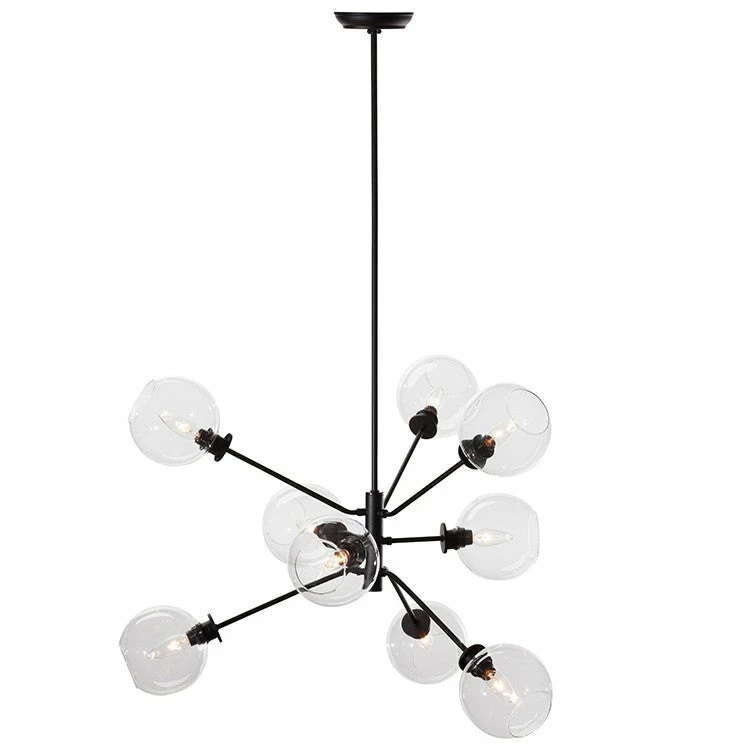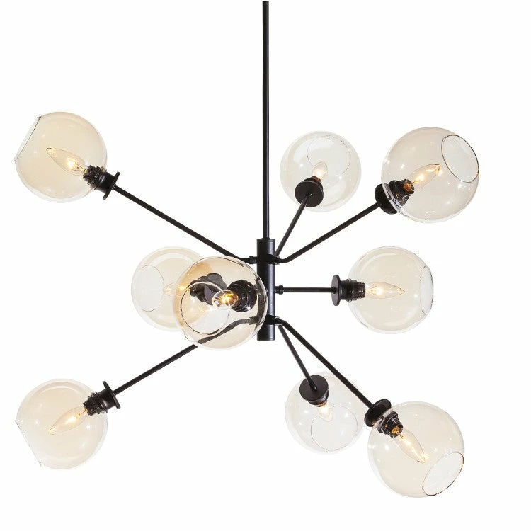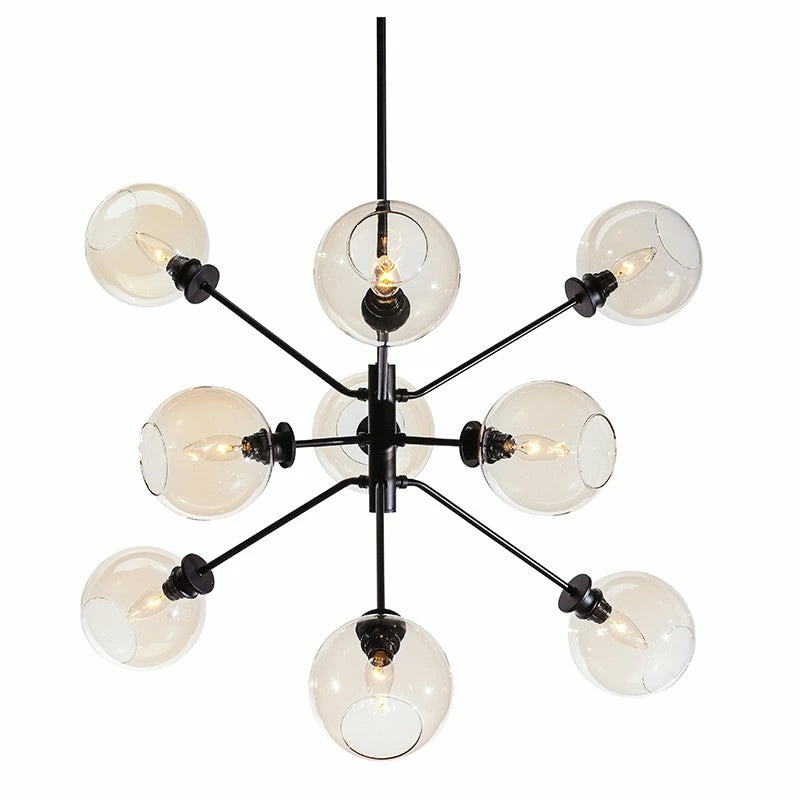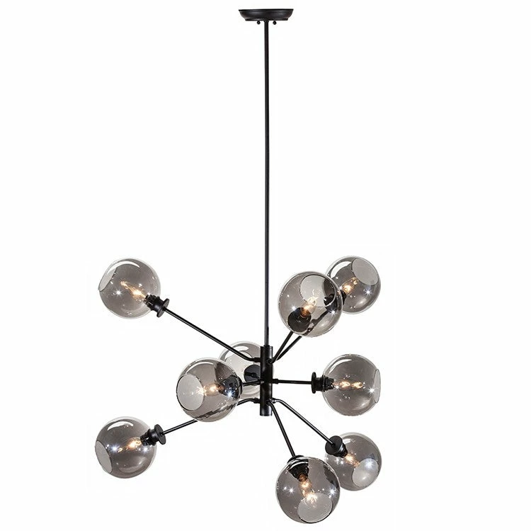 The Atom pendant projects a smart contemporary dynamic. Featuring 9 glass orbs on articulated multi-directional arms, the Atom is a unique urban pendant expressing a sophisticated modern energy. Suspended on a powder coated steel canopy, the Atom is adjustable to a maximum overall height of 47 and a half inches.